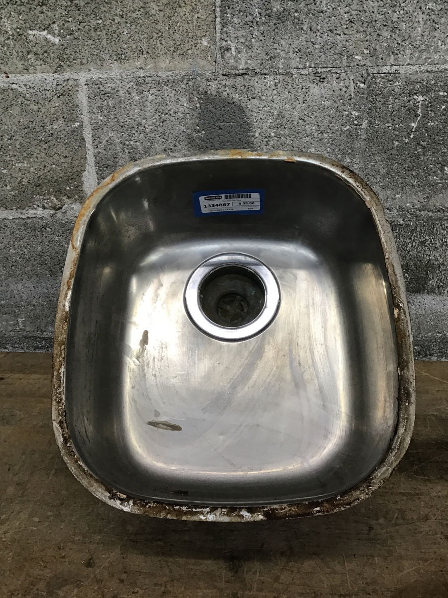 Stainless steel, undermount bar sink with some average scratching in the basin and a little schmutz left around the rim from its previous installation.