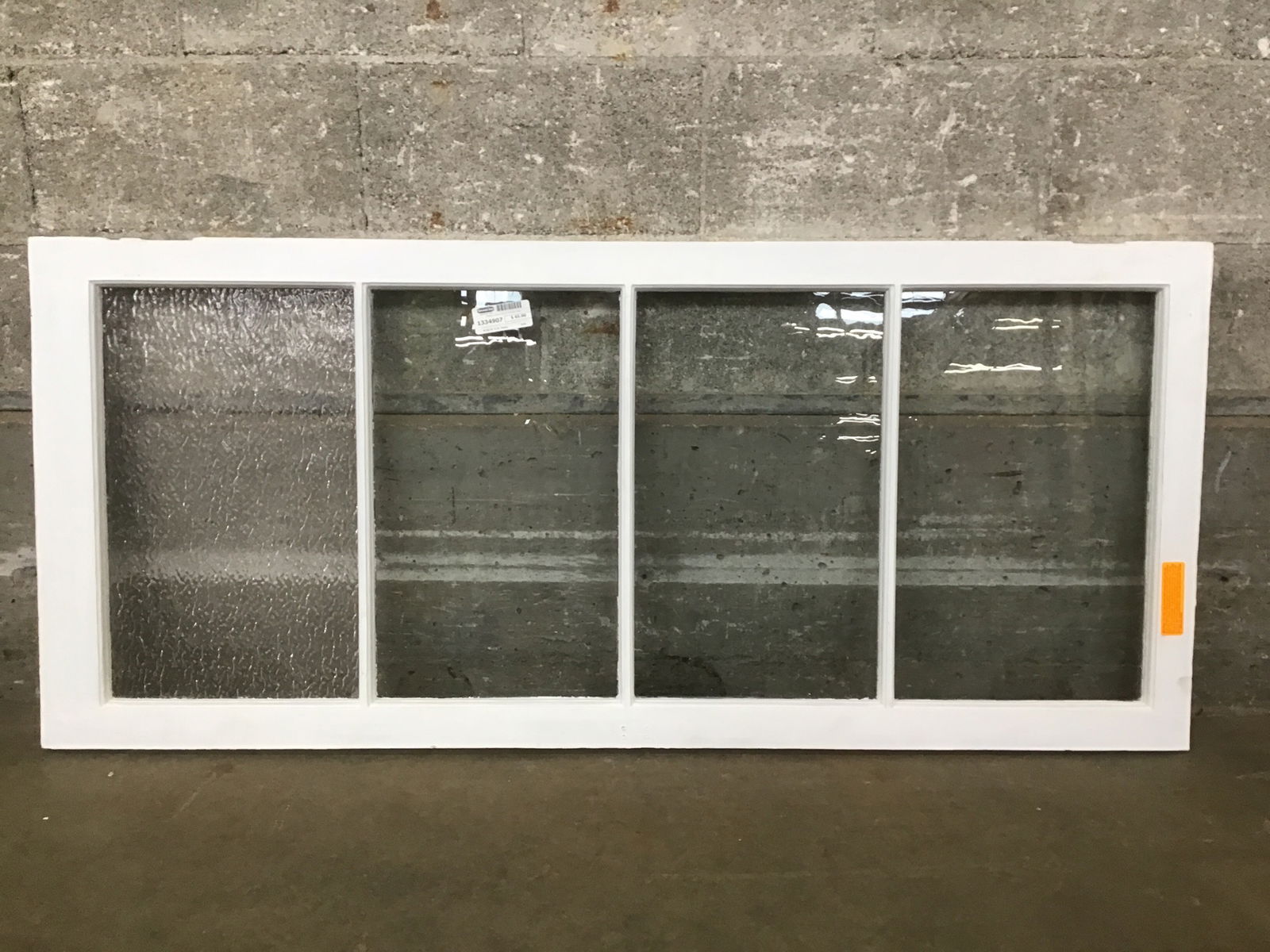 A wood window sash with four panes, painted white on both sides. Three of the panes are older wavy glass and one of them is obscured pebble glass.