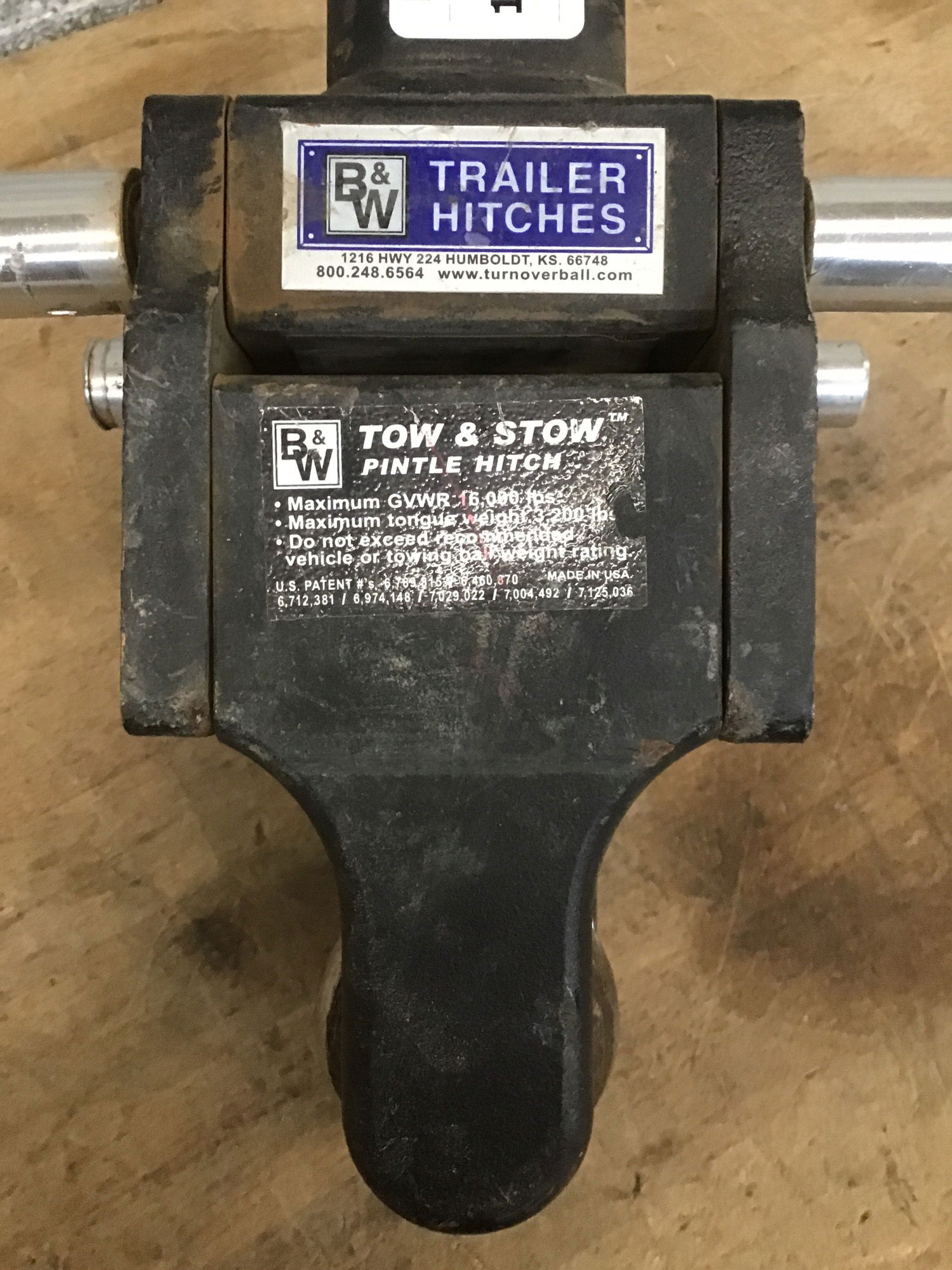 Manufactured by B&W Trailer Hitches, this is a Tow & Stow Pintle Hitch that's designed to tuck away under your vehicle when not in use. Sports an 8.5" drop and a 4.5" rise, with a 16,000 lbs trailer weight rating when used as a Pintle, but 10,000 when used as a ball mount. Currently has a 2-5/16" ball mount installed. Retails new for about $350.