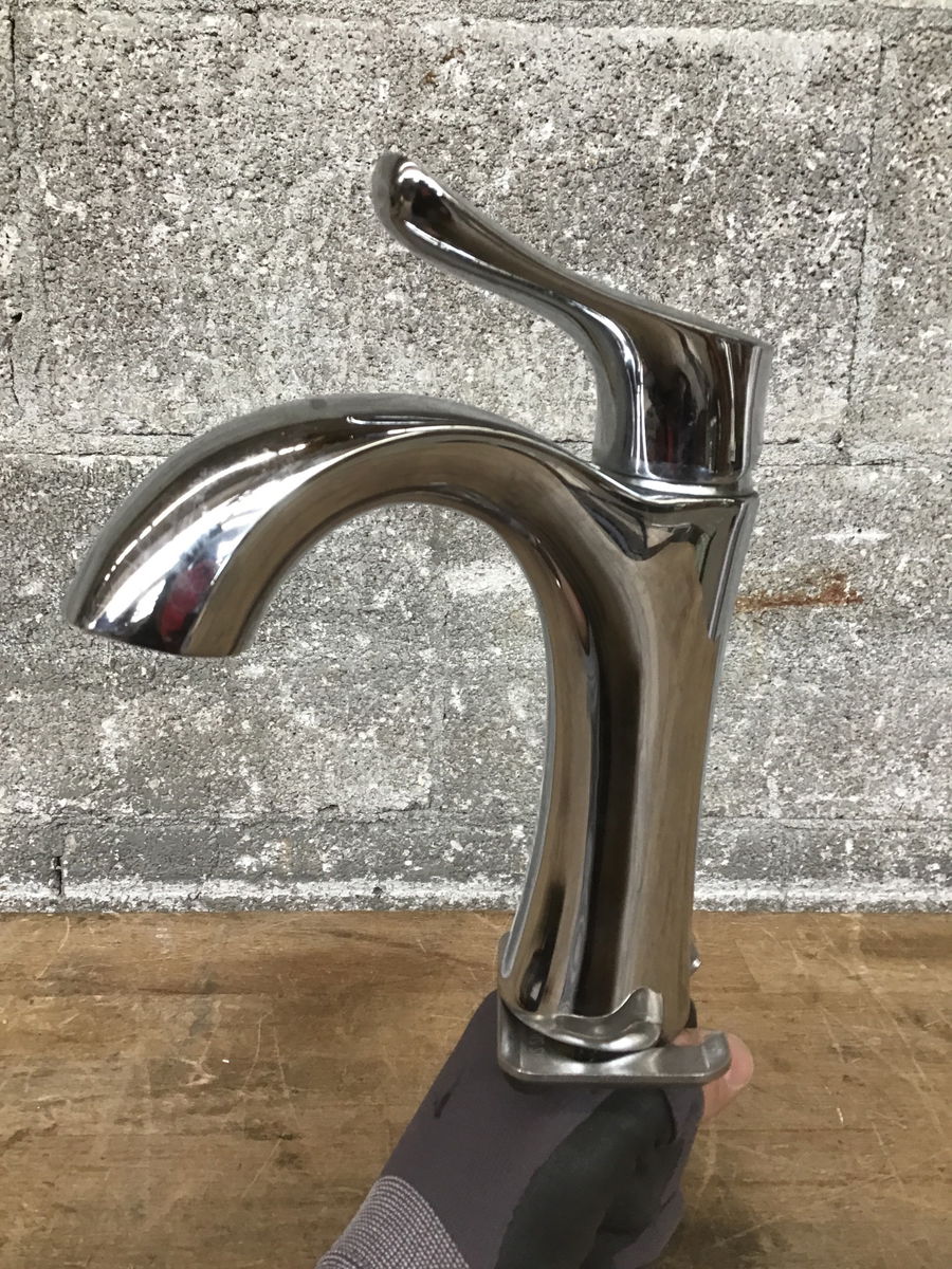 Chrome finish bathroom faucet with an attractively curved handle. Some light scratching but overall still in good, usable shape.