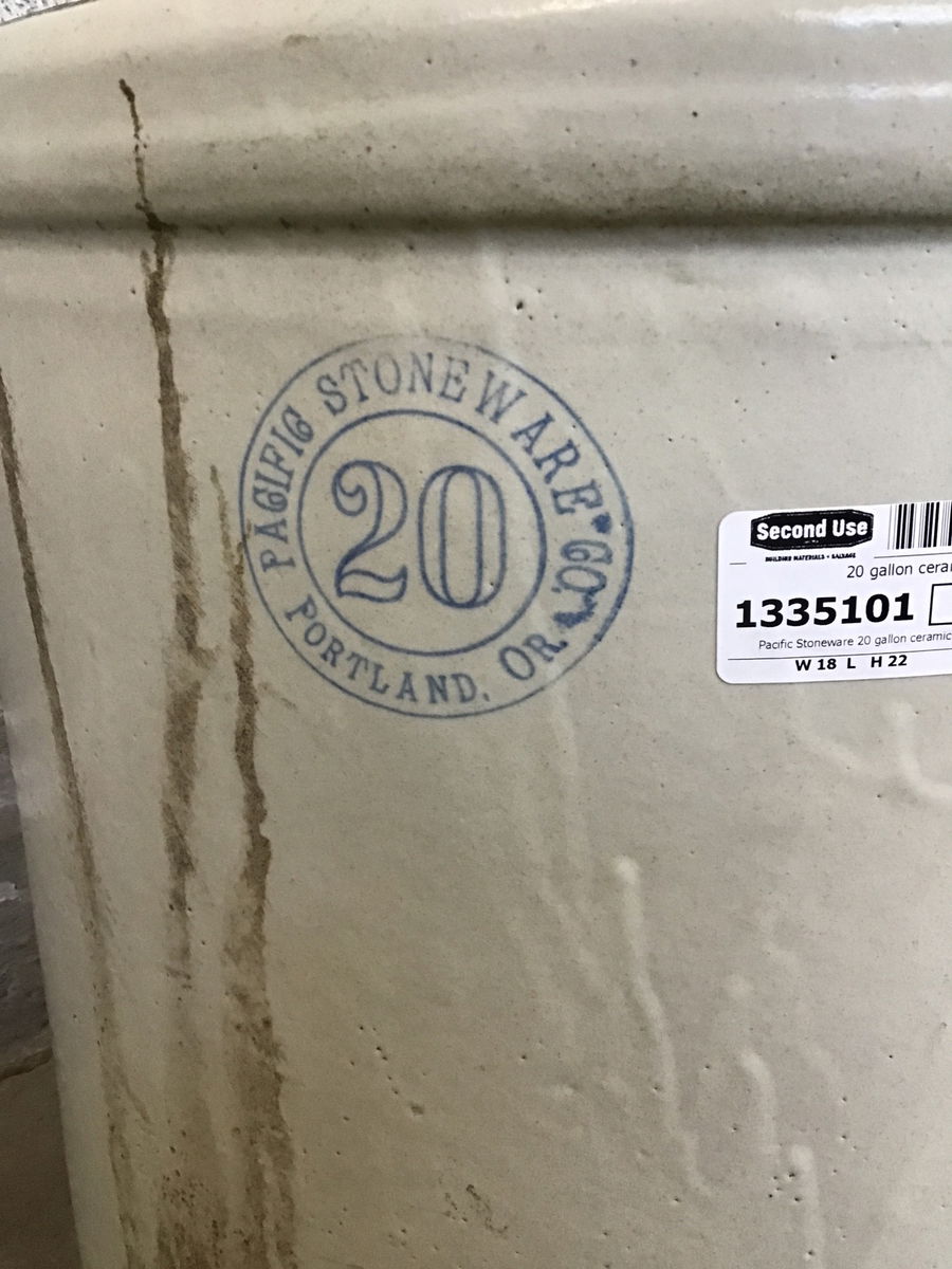 Pacific Stoneware 20 gallon ceramic crock. In good shape except a little damage near where a tap may have been.