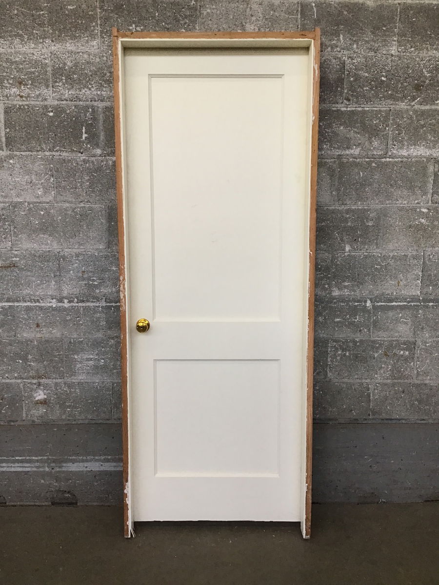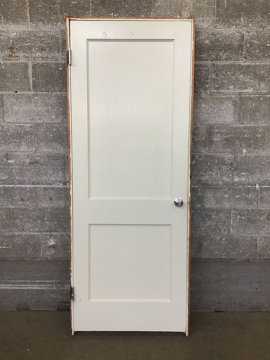 30" Two Panel Interior Door with a decent coat of white paint. Has a polished nickel knob on one side and a brass one on the other.