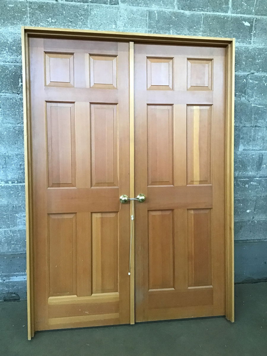 56" 6 Panel Interior Double Door made from stunning CVG fir and has a brass knobset with a push button lock. This door is ready to go inside your home!