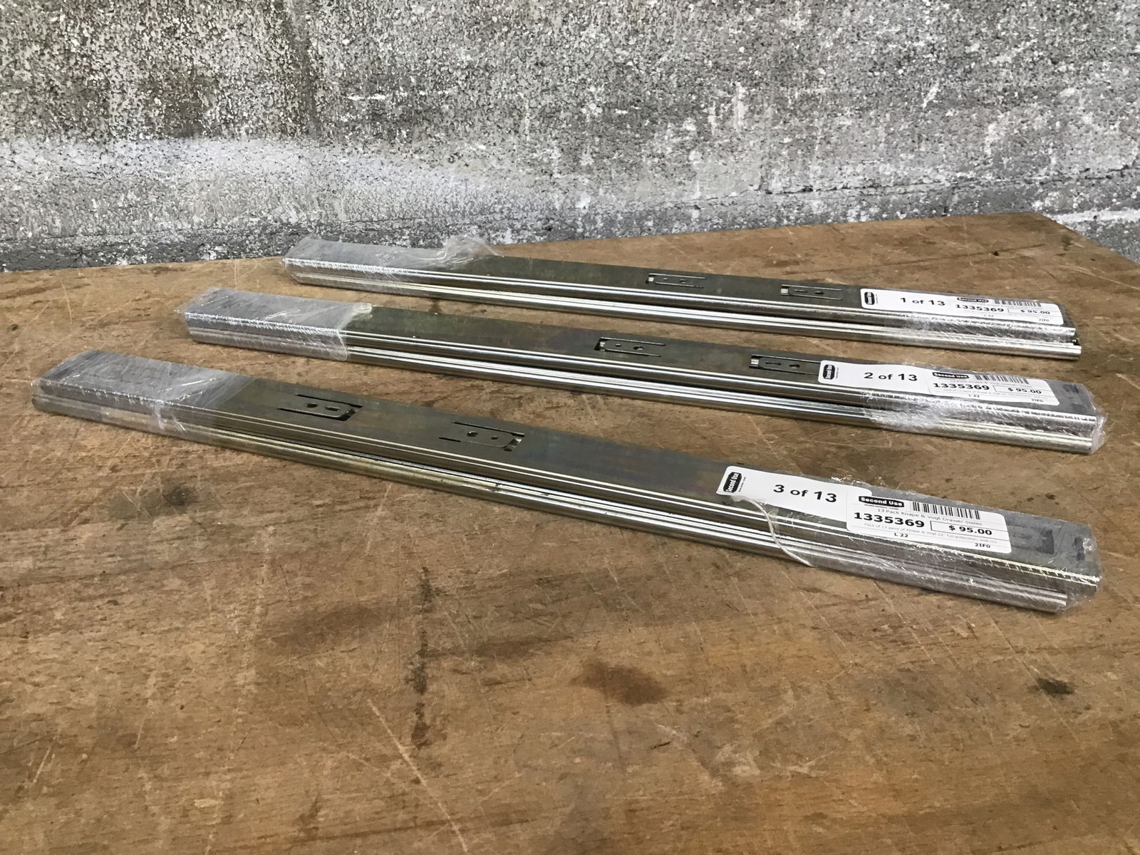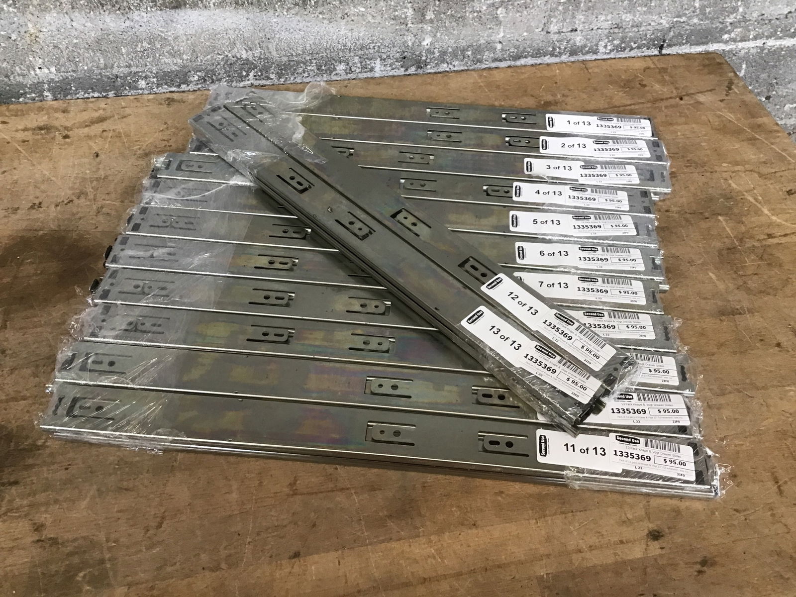 Pack of 13 pairs of Knape & Vogt 22" full-extension, side mount drawers slides ready to upgrade your cabinet drawers! Sold as a set of 13.