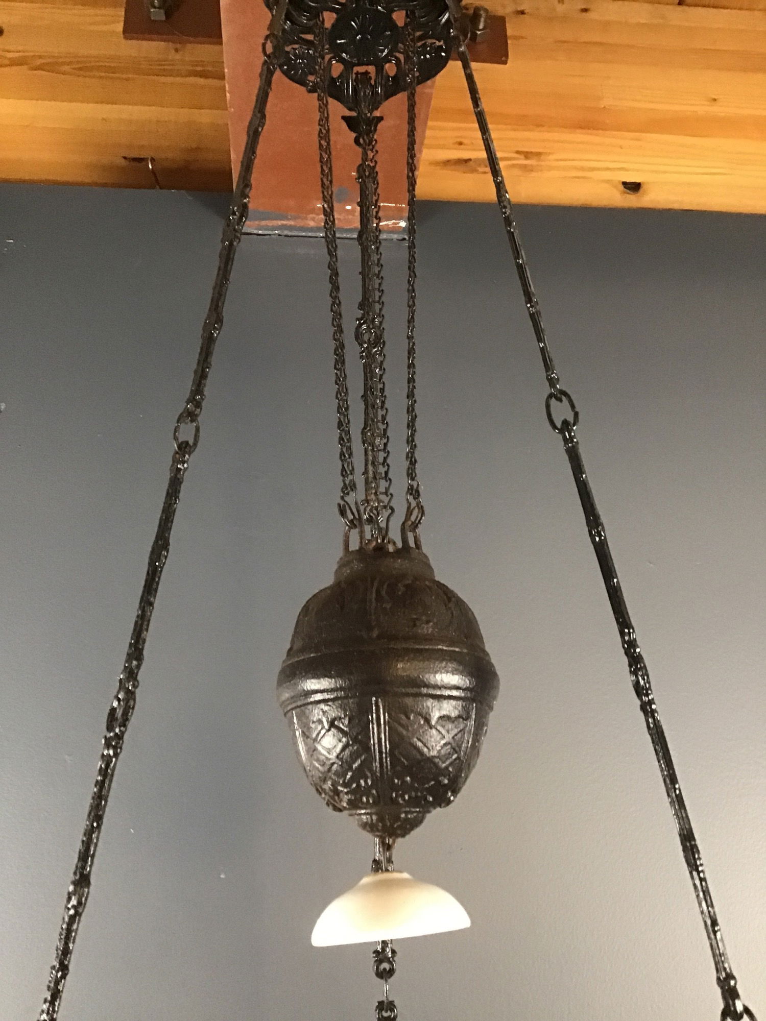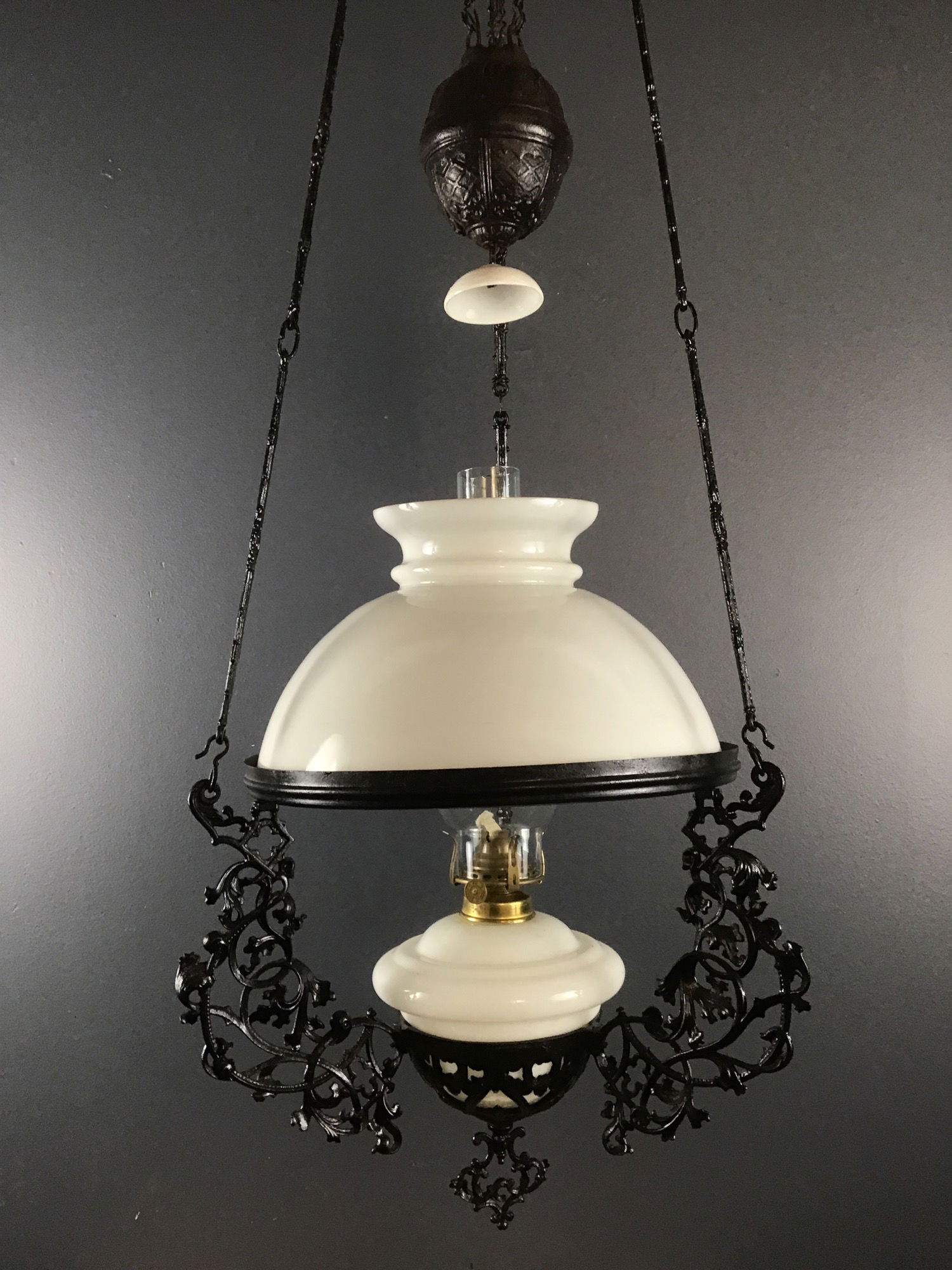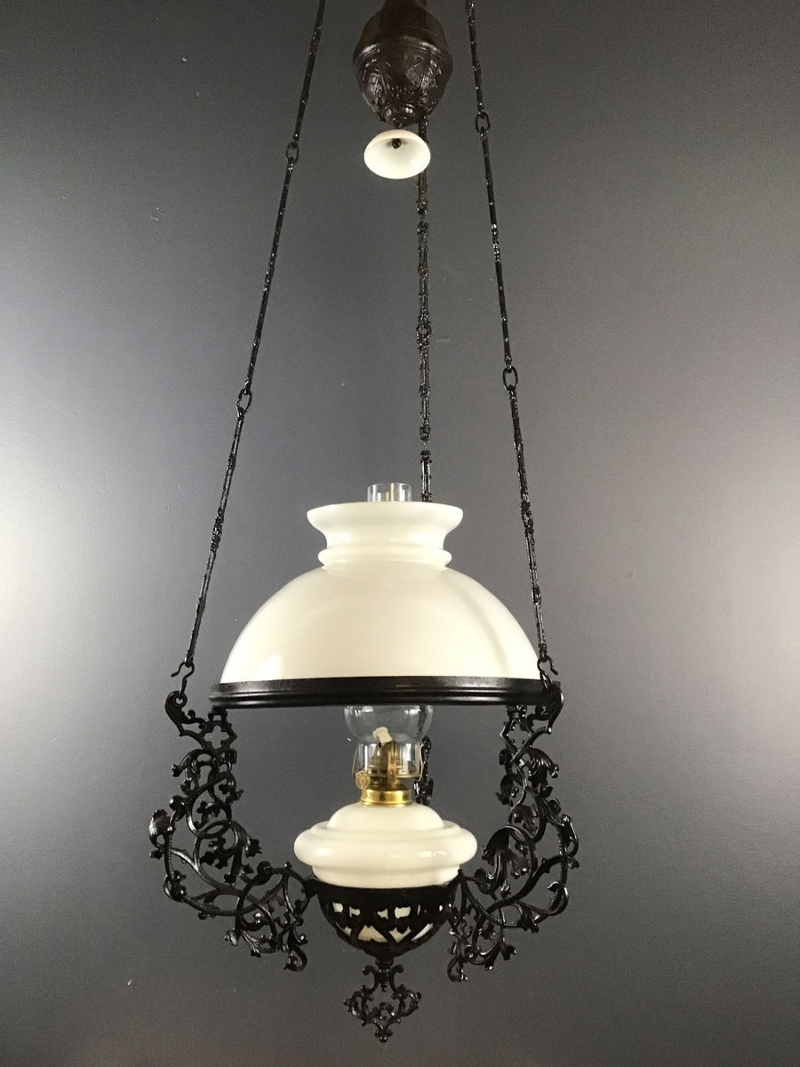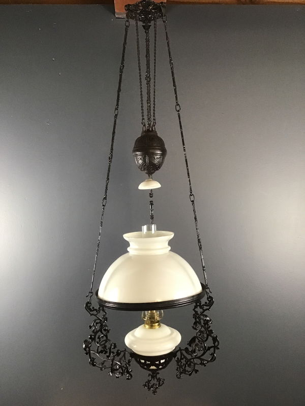 A gorgeous 19th Century Dutch Colonial kerosene lamp that's painted black with a milk glass shade, and font, and a clear hurricane shade. The brass burner is newer. It has a decorative counterbalance, so that you can pull the font down in order to light it. It has a hook on top so that you can hang it on any heavy duty ceiling hook. It's truly a gorgeous piece of history!