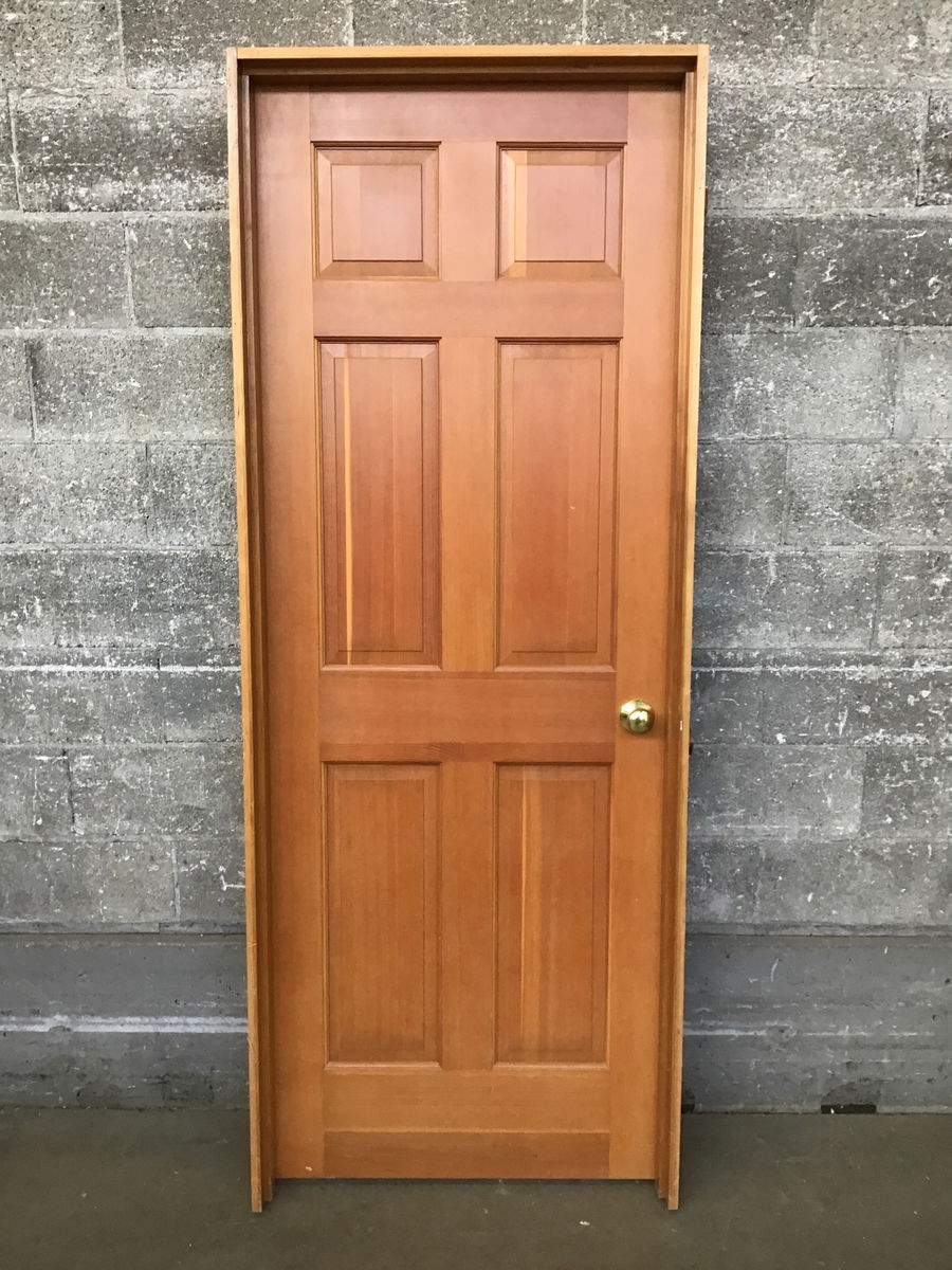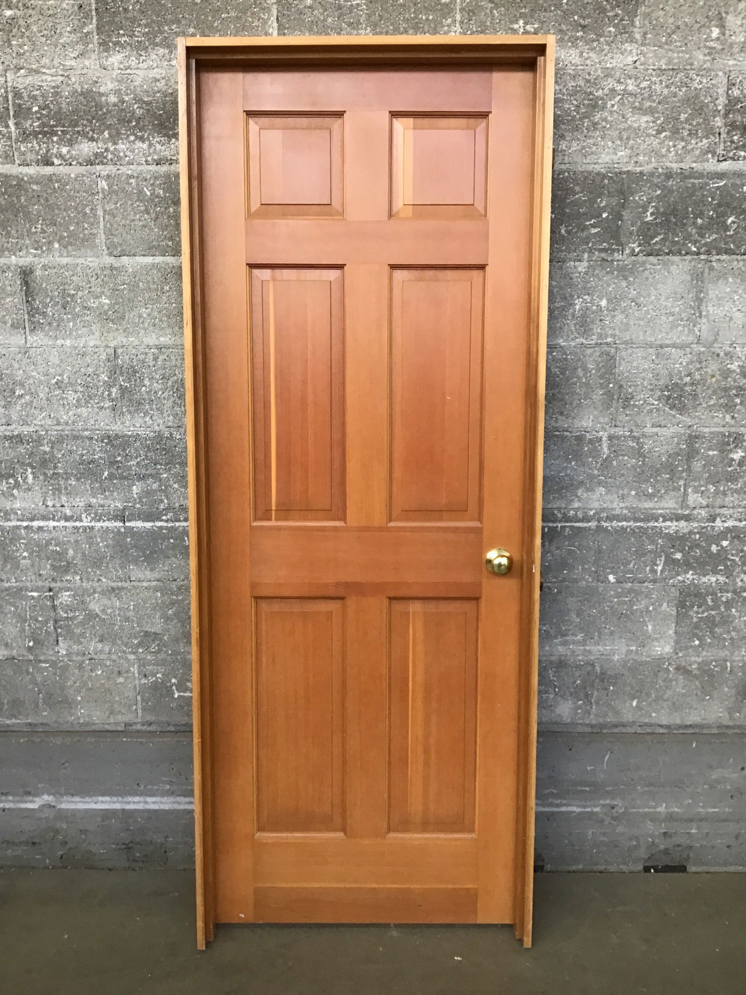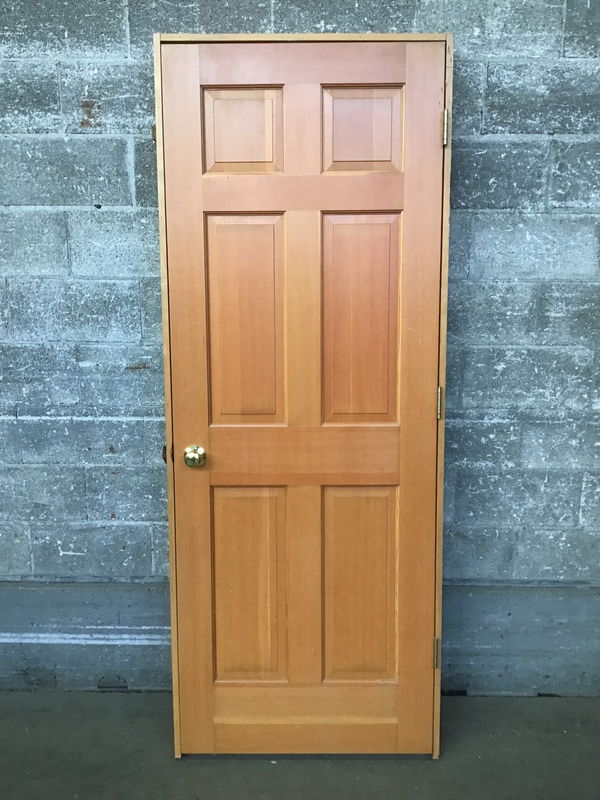 Well-preserved six panel fir door ready for reuse-jamb is in good shape and includes its original hardware. Average cosmetic wear.