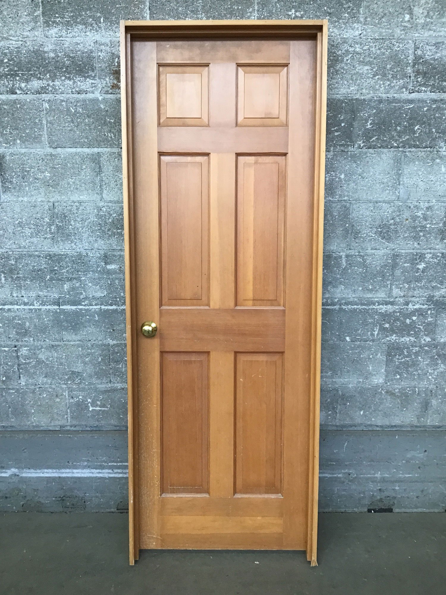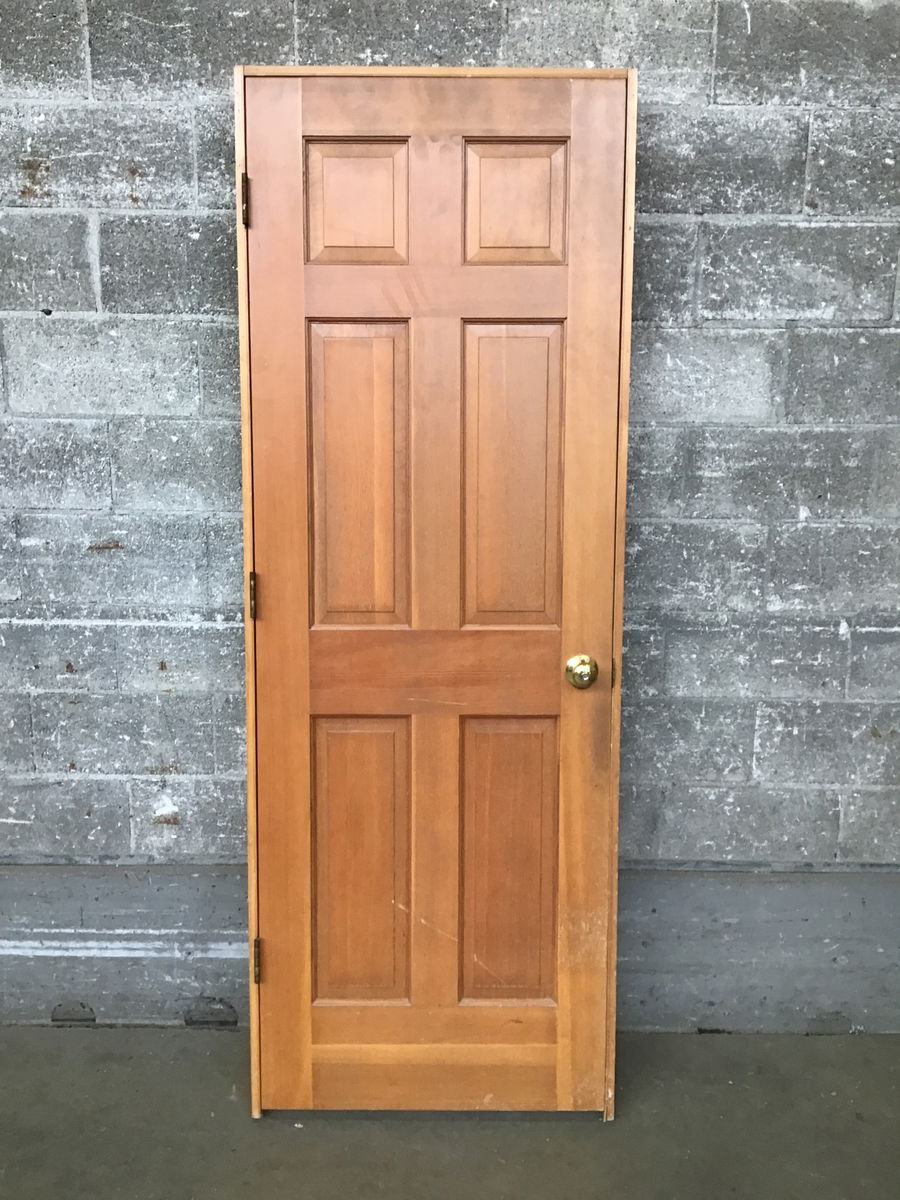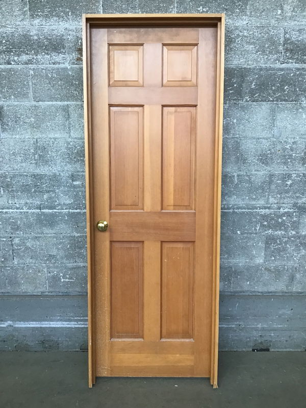 Well-preserved six panel fir door ready for reuse-jamb is in good shape and includes its original hardware. Average cosmetic wear.