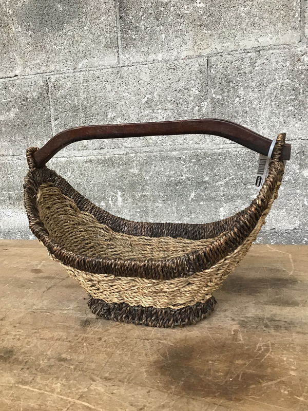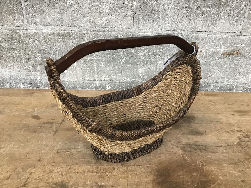 A woven basket of some type of grass with an attractive crescent shape and wooden handle.