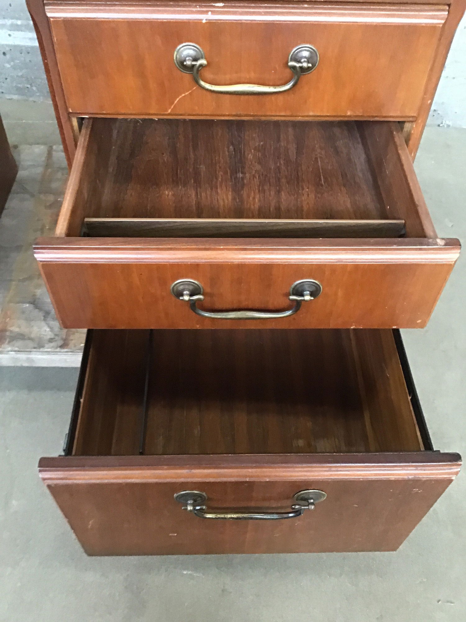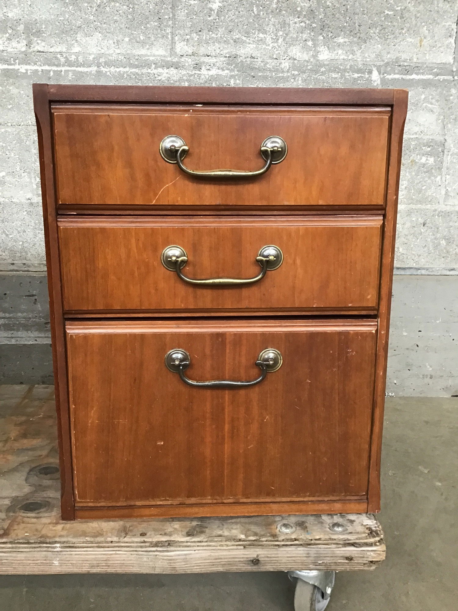 Handy solid wood filing cabinet, looks to be poplar, from Alma Desk Co. Has three drawers that slide easily and a nice dark stain all over. Seems it was once part of a larger desk, but has since lost its desk top.