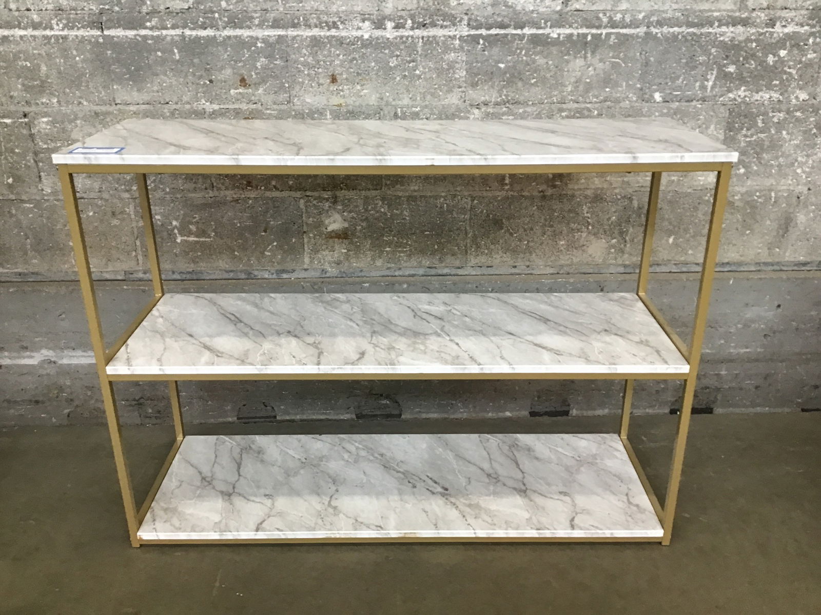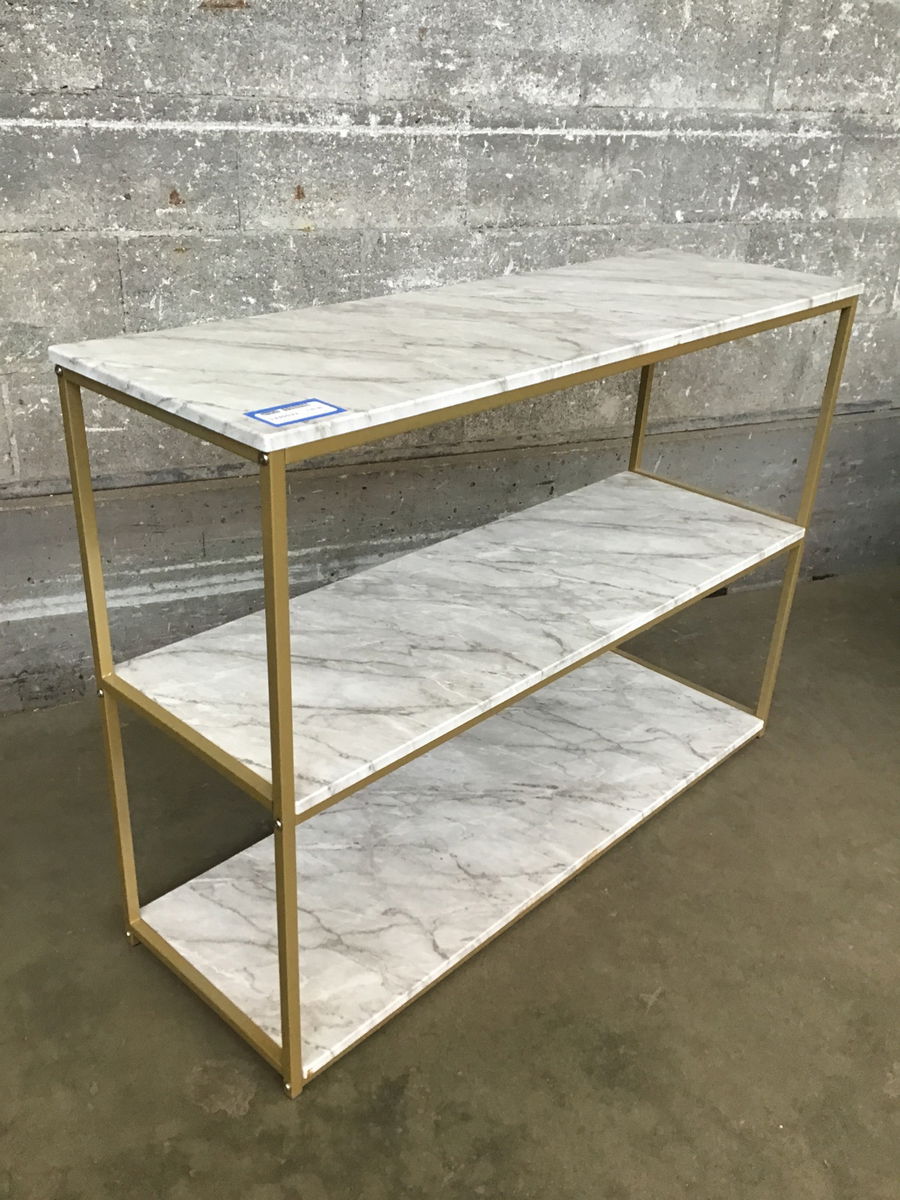 Modern shallow shelf unit with three levels. Has a brassy frame with photo finish marbly shelves. Would be a great fit in an entryway or hallway.