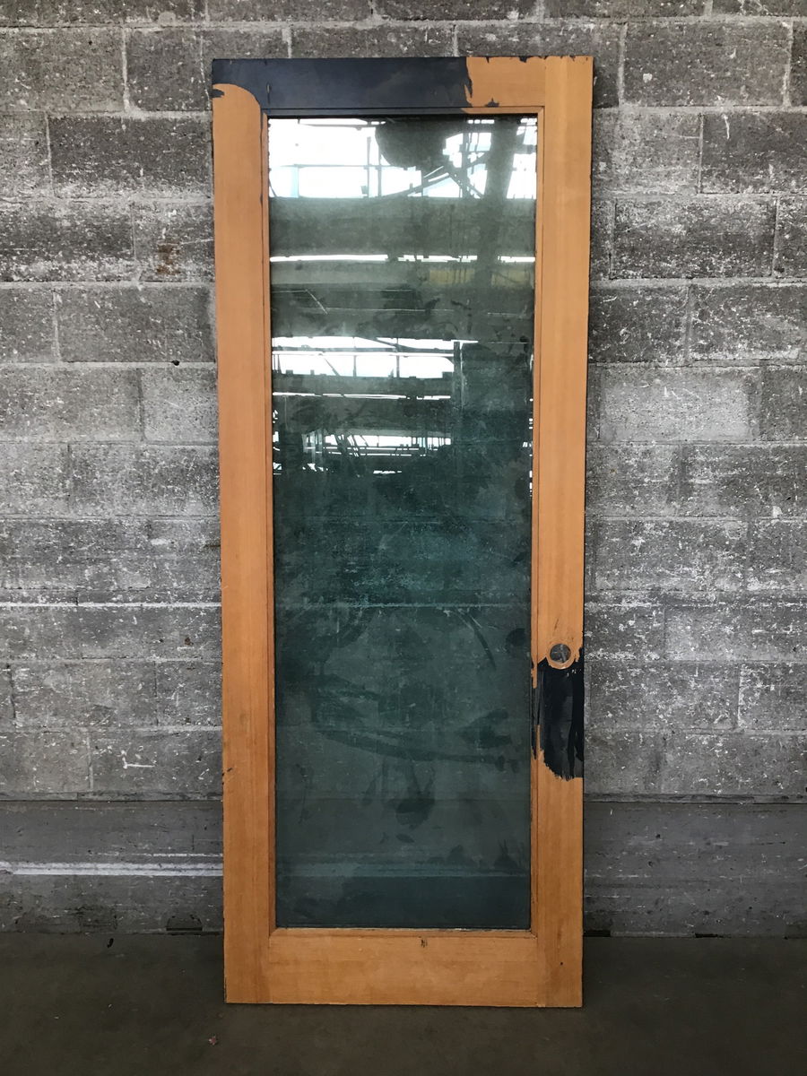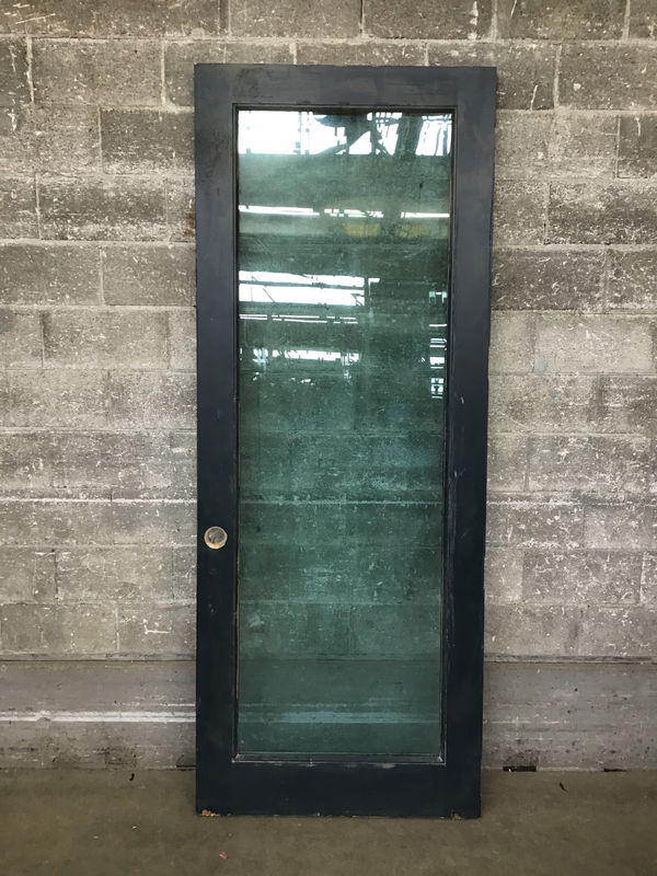 A long tall n handsome door ready to take ya'll to the prom in back! Are you feeling it now Mr. Krabs?? This solid wooden door features a full lite of thermopane and tempered transparent glass and what looks to be a pine wood construction. This was most likely used in a commercial setting but could also be used in a home with tall ceilings.