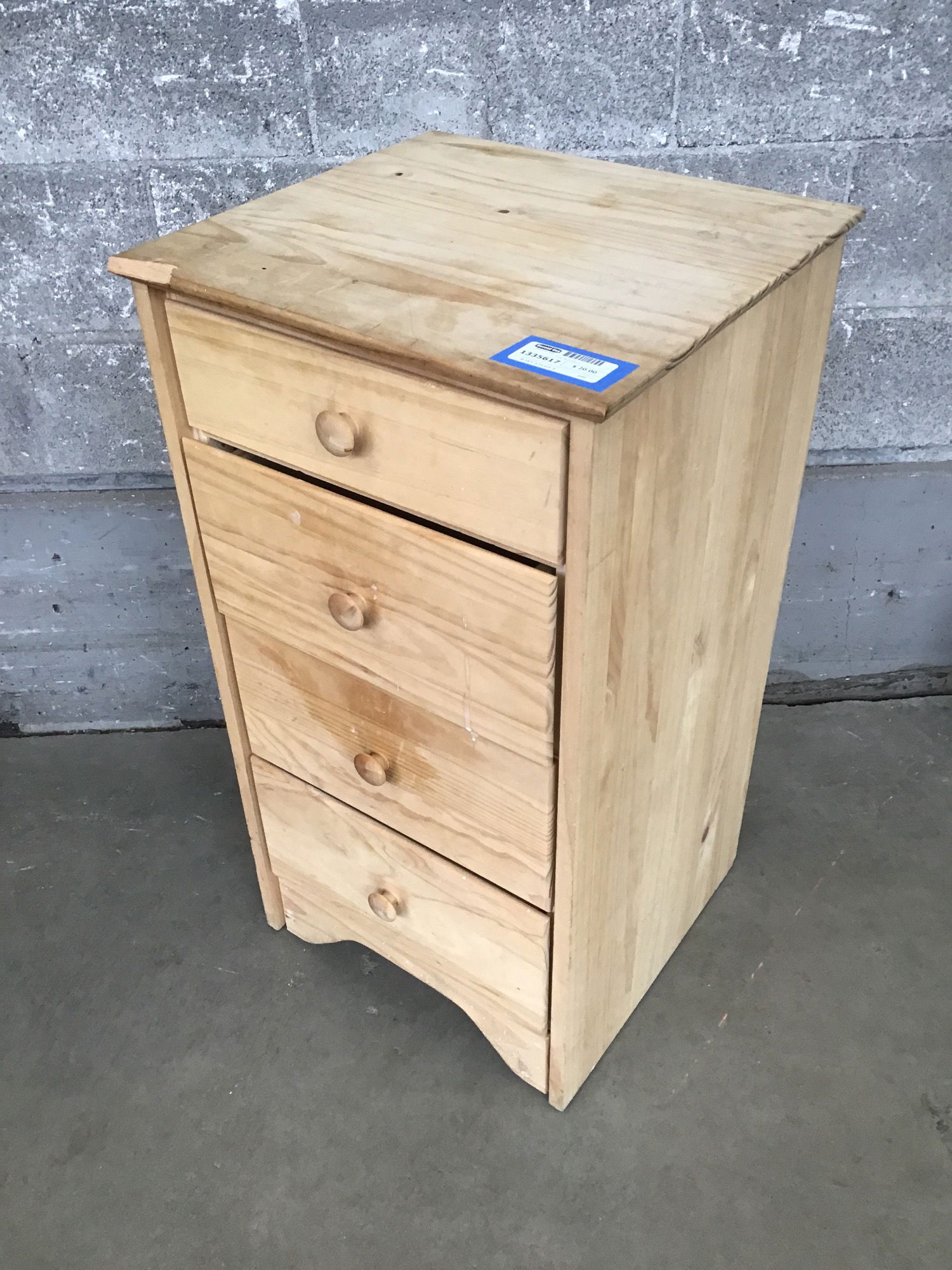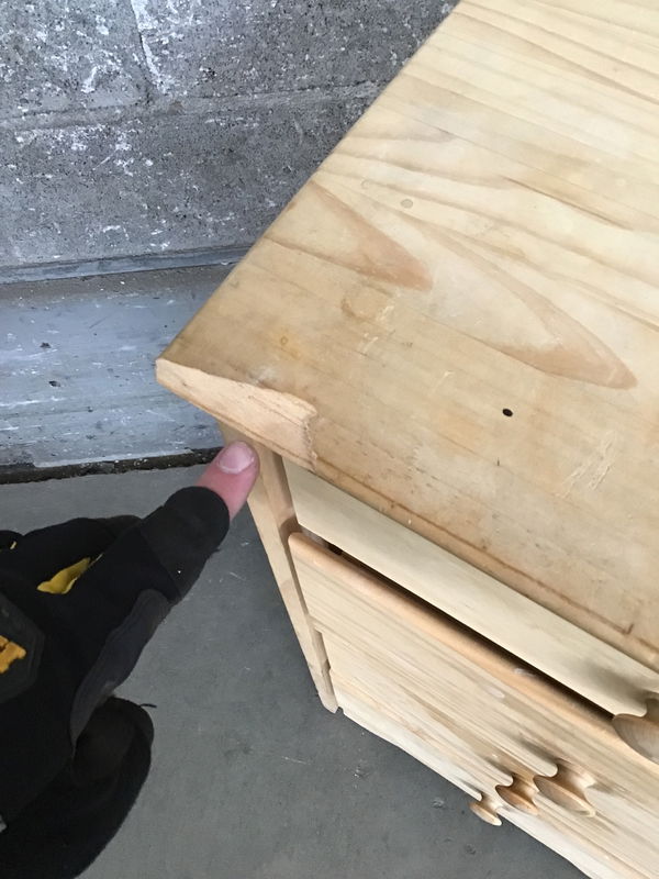Simple nightstand or teeny dresser with drawers that slide super easy and matching pine knobs on the fronts. Has a bite taken out of the top on the front, price reflects.