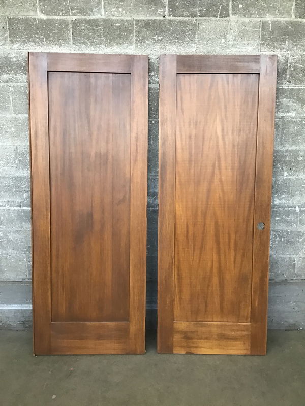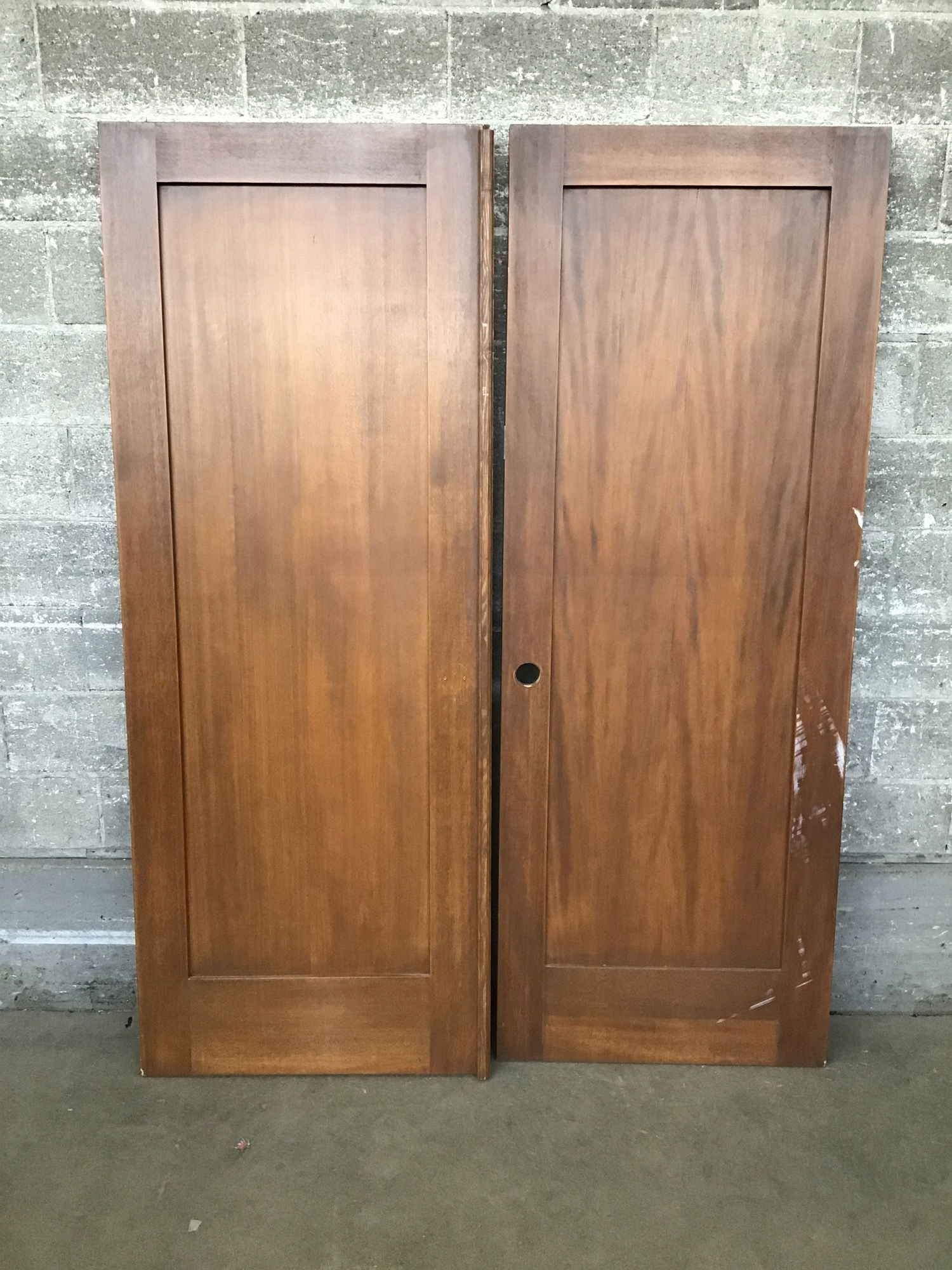 A set of single shaker panel fir double doors with a rich alluring stain and excellently contrasting wood grain. These would make great interior double doors for your home.