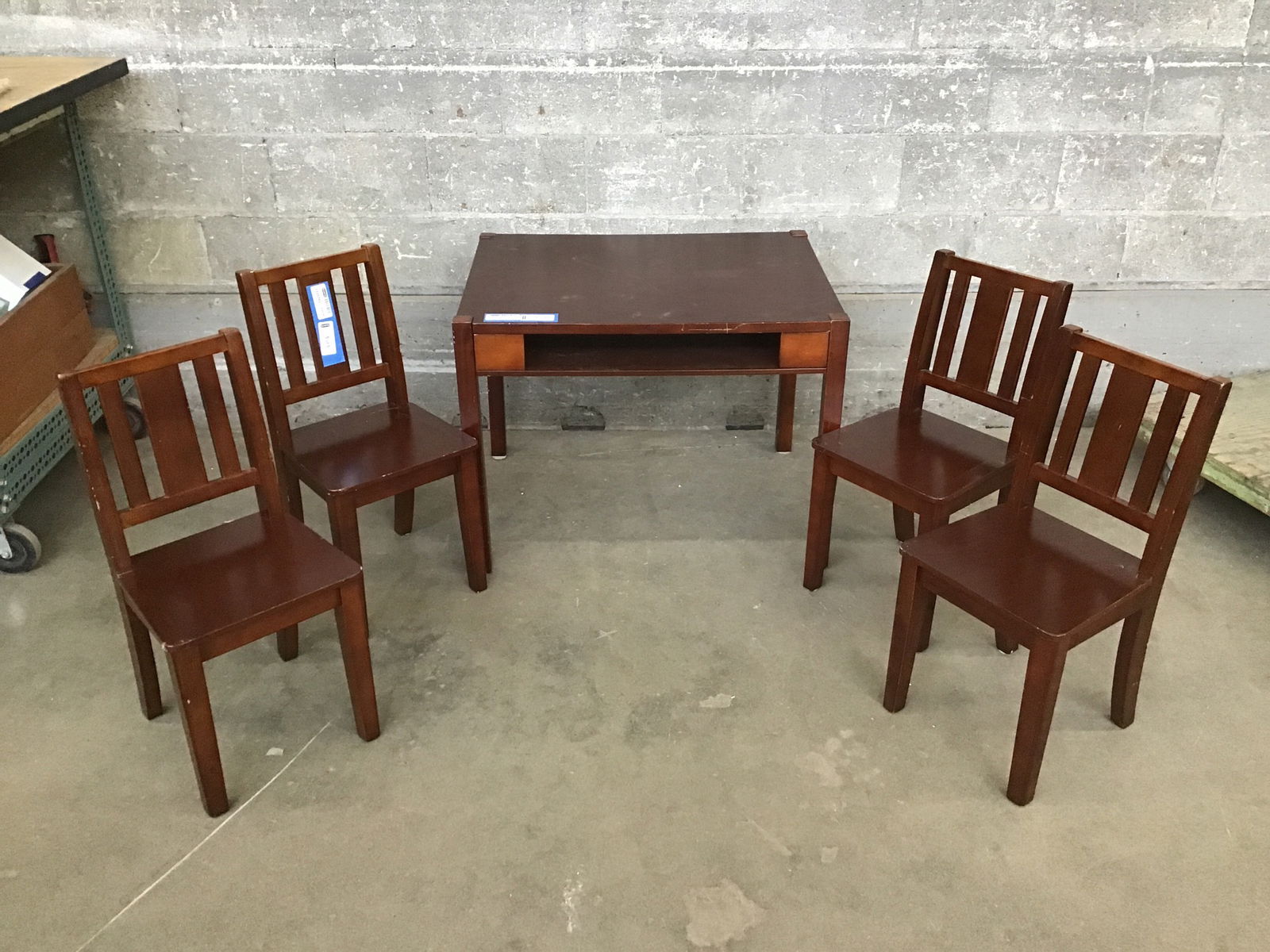 Table with 4 chairs in an espresso finish for the sophisticated youngster in your life! The table has a storage cubby under the top so they can hide away those pesky spelling practice sheets while their classmates are over for an evening grape juice tasting soiree. A similar table set (with only 2 chairs) is selling for $300 at Tarjay.