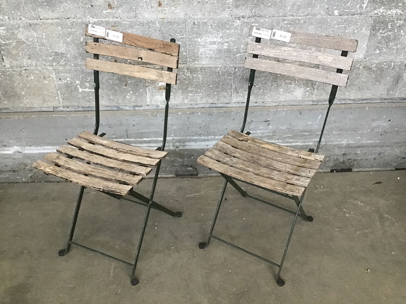 A chair of bistro pairs with dark green painted legs. The wood is faded but in good shape, aside from one slat that needs to be partially reattached (price reflects).