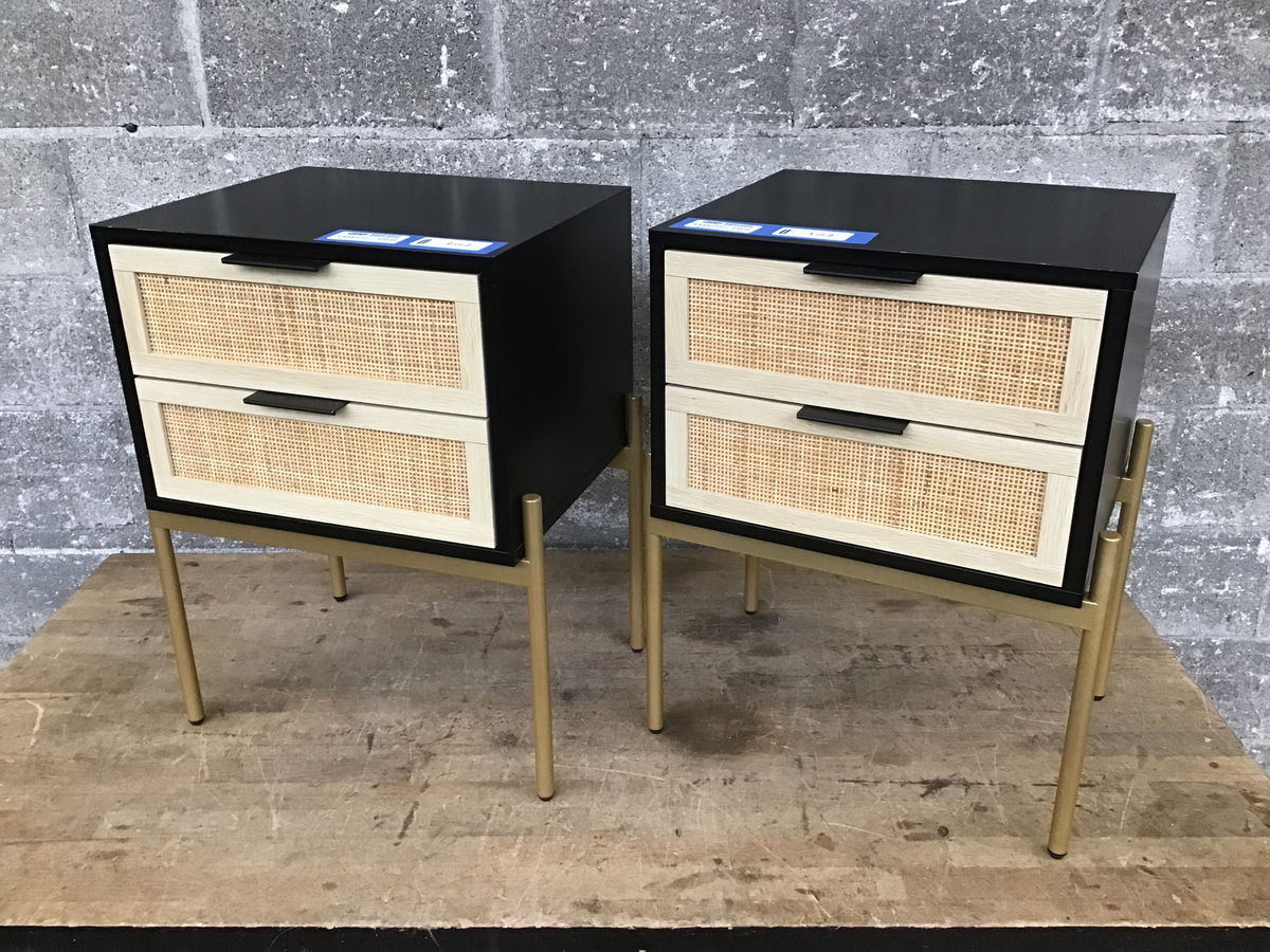 A pair of Nathan James "Andrew" side tables, or as I like to call them, Nate Jim "Andy" end tables. Chic gold bases and clean, modern lines are softened by natural rattan drawer faces. The drawers are nice and glidey and the legs have leveling feet just in case your floor is wobbly! These retail for $111 each at Hemo Dopet.
