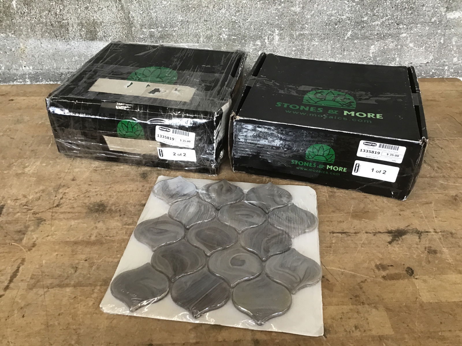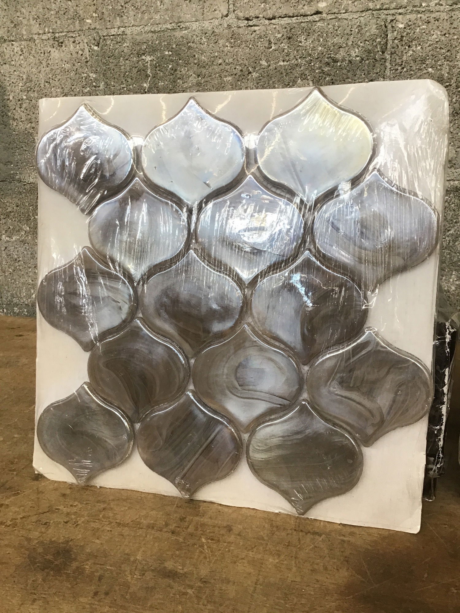 A smaller set of decorative tiles in a fedora shape made from melted glass in a swirly taupe color. There are a total of two boxes, 19 pieces in total to cover an area of around 15 square feet. Would make for an unique backsplash.