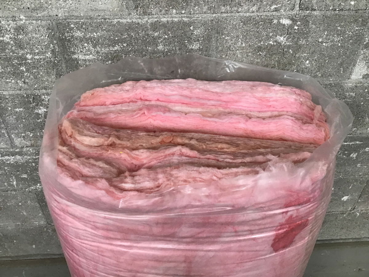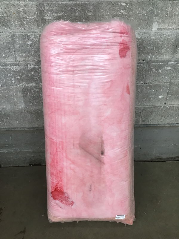 New bag of insulation that arrived without labels from the factory. Bag contains ~48 SF of coverage and is likely R-19 based on the batt thickness.