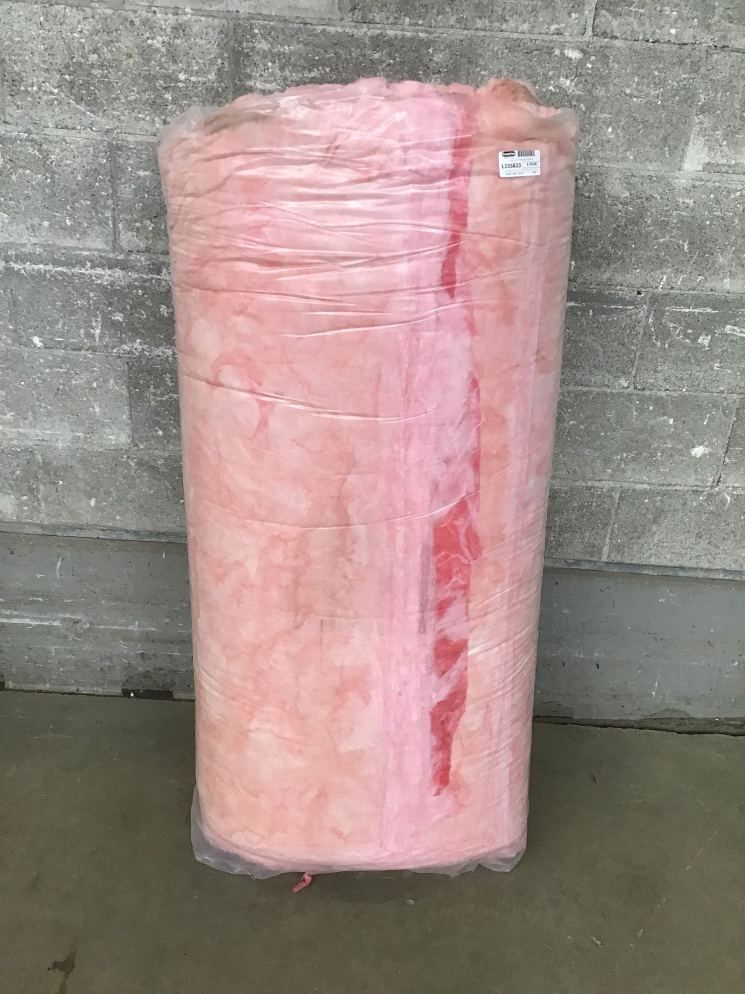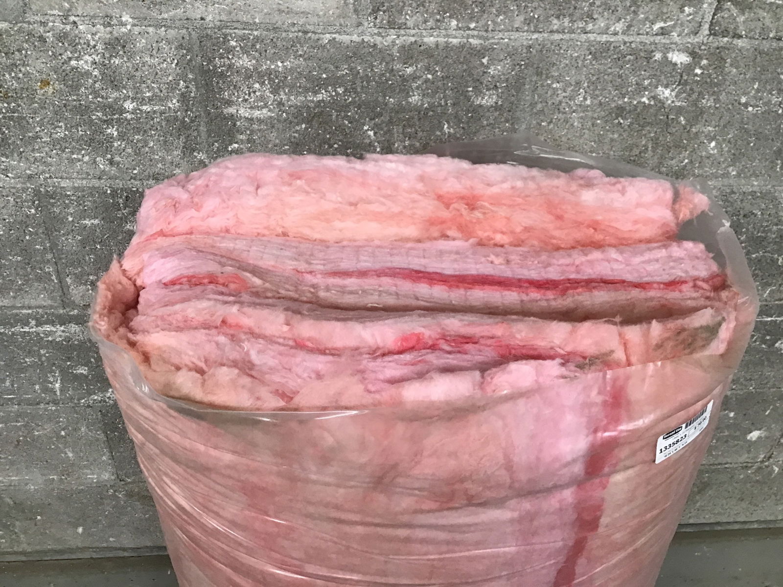 New bag of insulation that arrived without labels from the factory. Bag contains ~48 SF of coverage and is likely R-19 based on the batt thickness.