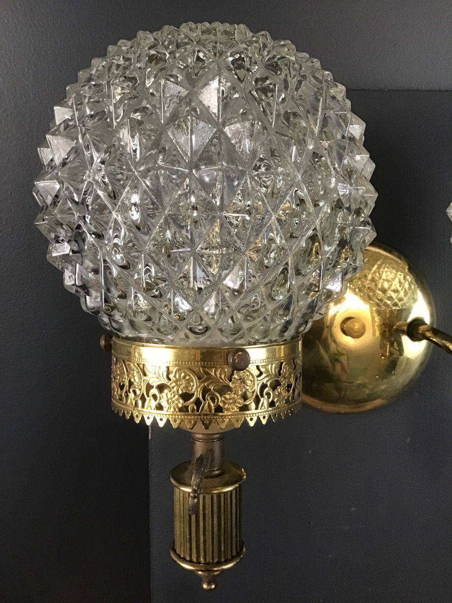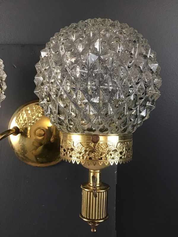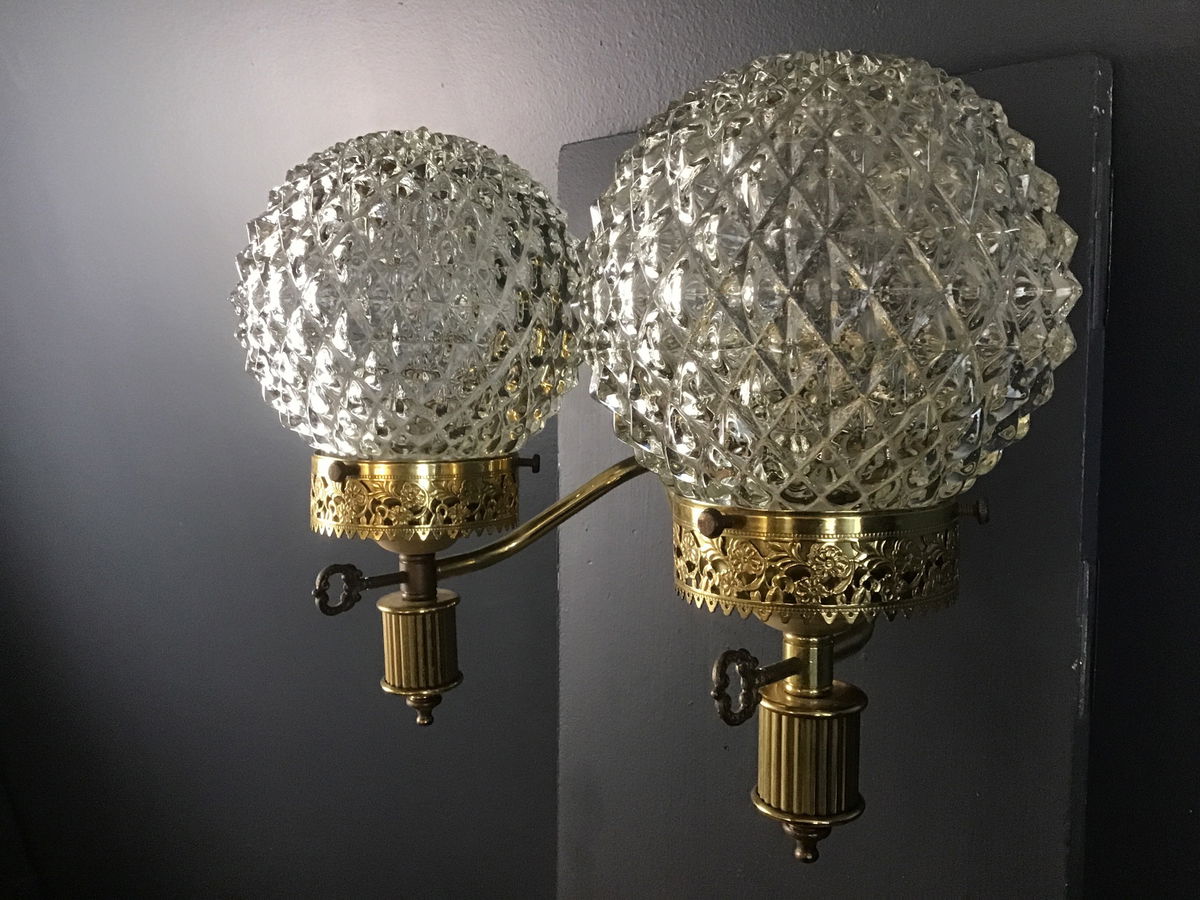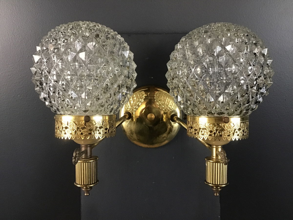This double arm wall sconce from the 60s-70s has been paired with era appropriate spiky glass globes.