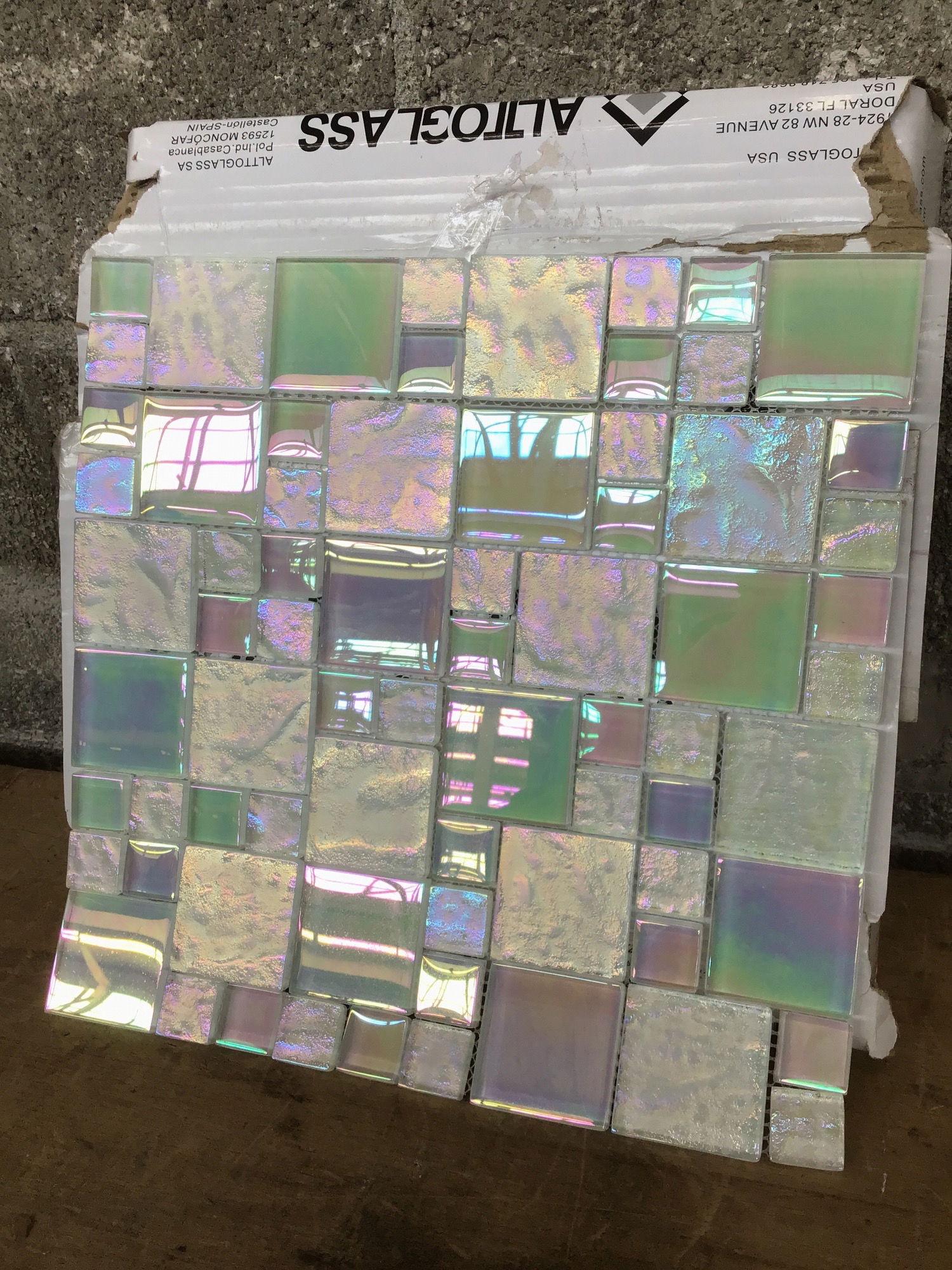 A small set of opalescent decorative tiles, 5 pieces in total. Made by Alto Glass in 2018. Would make for a very fabulous edition to a home that appreciates all things holographic and magical unicorn adjacent.