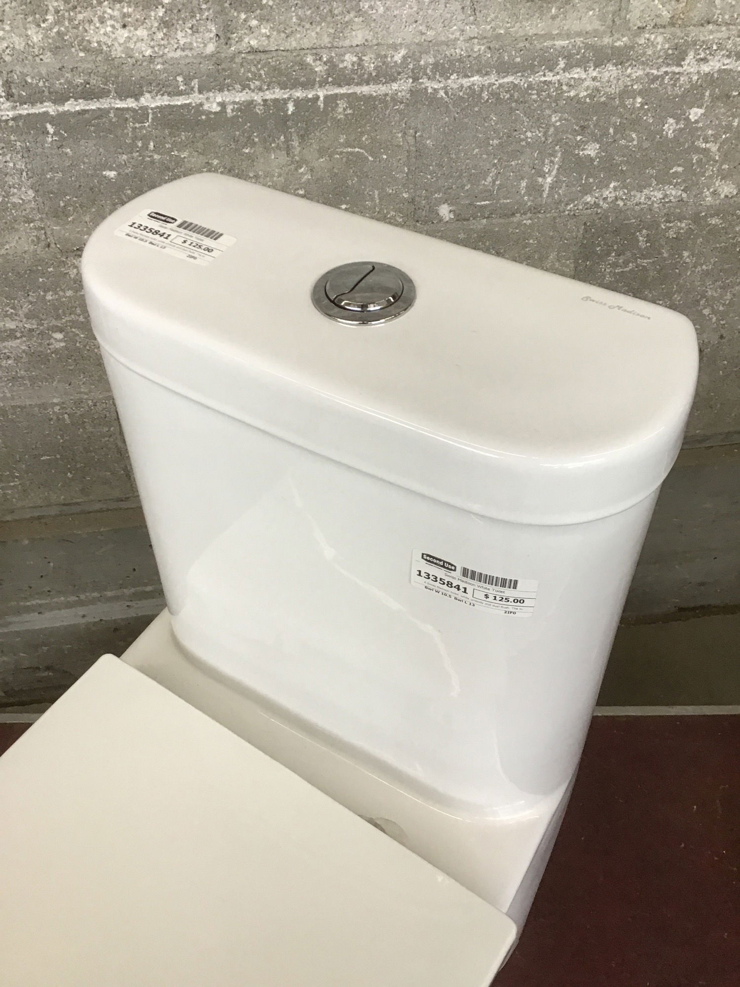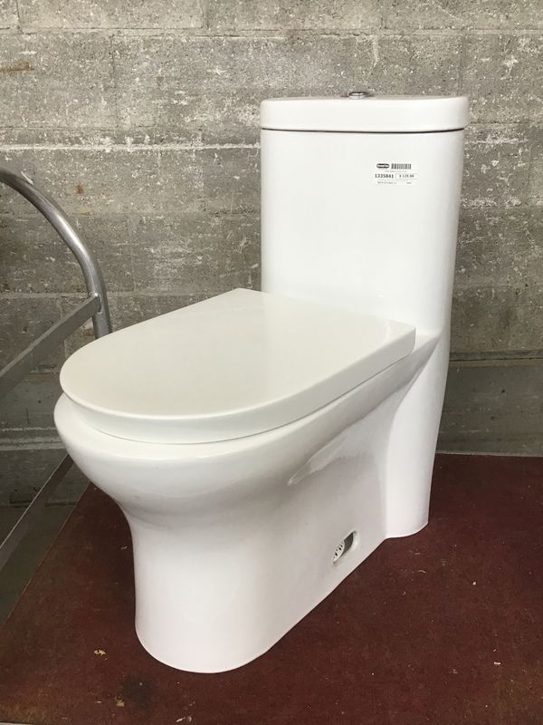 A Swiss Madison toilet, white unibody and dual flush. The toilet seat need to be readjusted but this should be a minor fix.