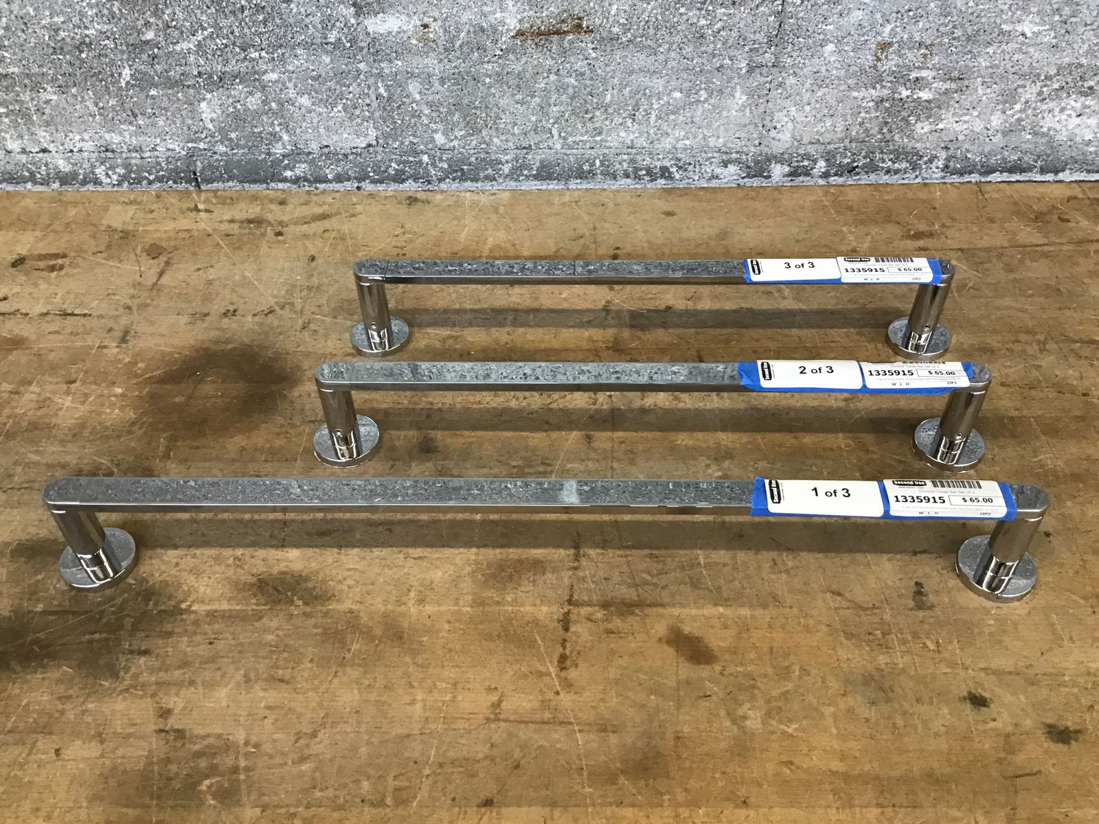 A set of three shiney chrome towel bars that appear to be devoid of any brand name. They look very sleek and modern and would look perfect in a home that like shiney things. One longer bar at 25" in length and two shorter at 19" in length.