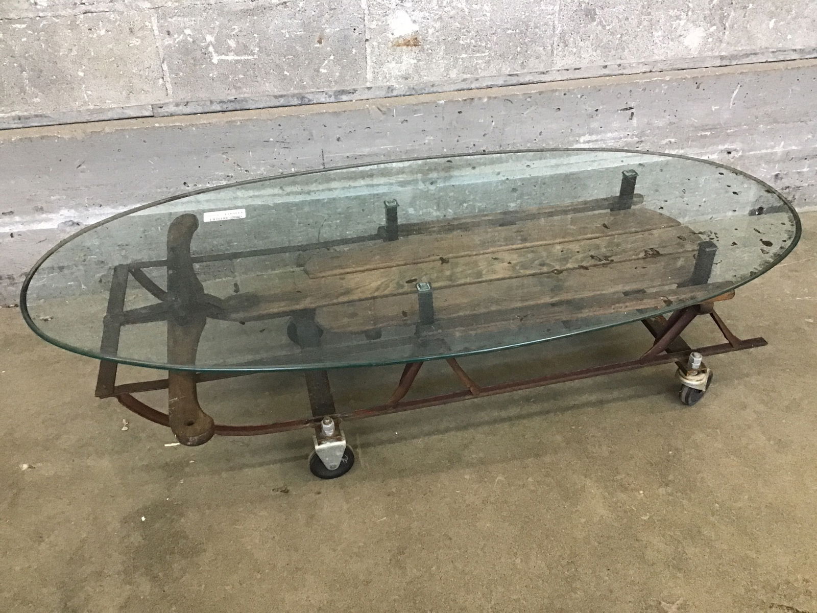 No, seriously. It's a vintage snow sled that's been turned into a rolling coffee table. How awesome is that? Aside from the glass top needing a serious scrubbing, it's in great shape too.