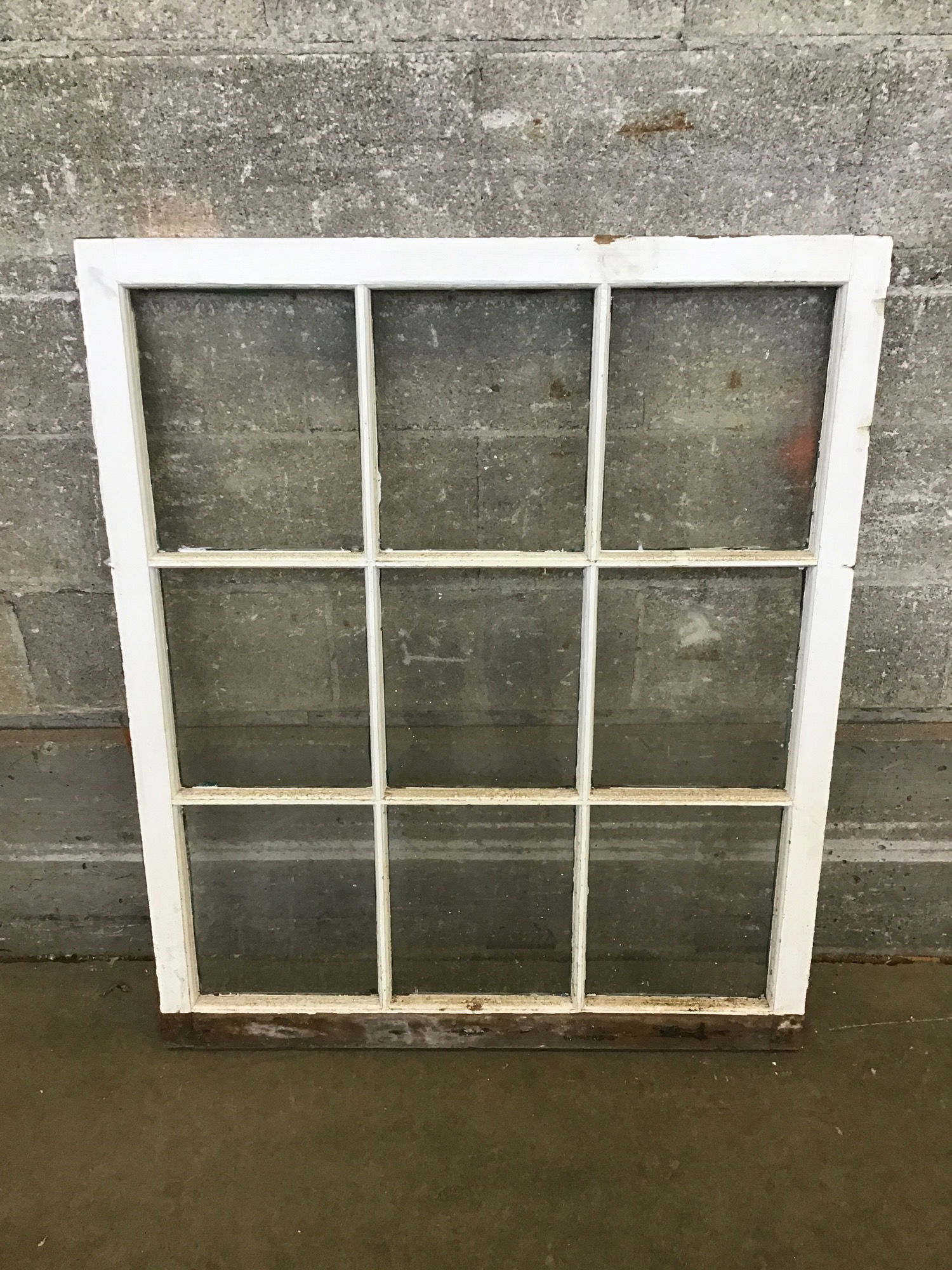 Vintage true divided sash with 9 single pane lites. Painted white on one side and green on the other. In decent shape, but definitely in need of a good scrub.