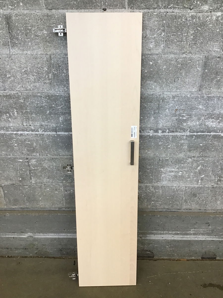 Birch-y-finish Ikea brand modular cabinet door with nice snap-together, soft close hinges. You could also take the hardware off and use the door as sheetgoods for a DIY project!