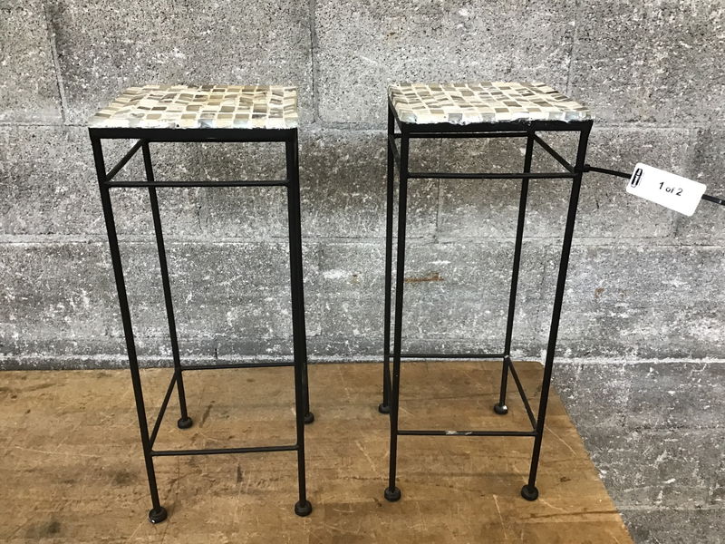 Two petite plant stand with a mixed surface of warm gray mosaic tiles. Perfect for us Seattle folk.