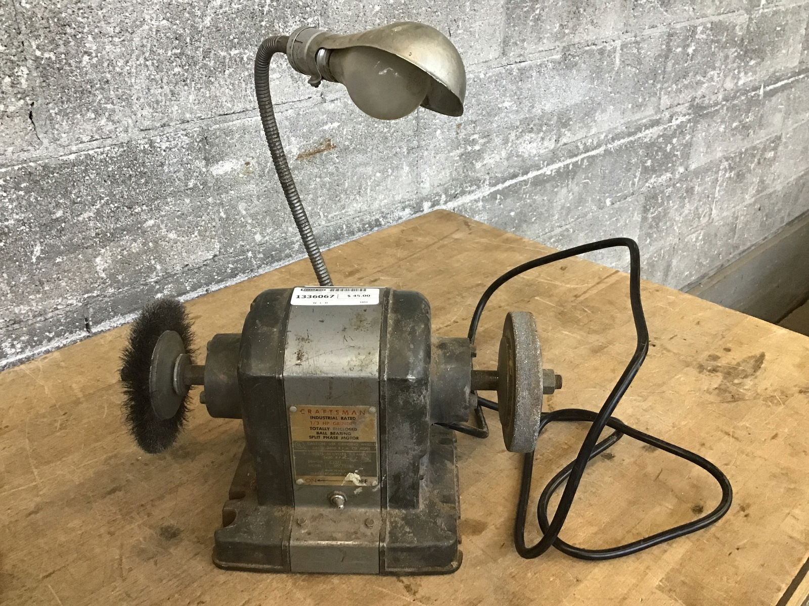 A silvery industrial vintage Craftsman Grinder, 1/3 HP, ball bearing split phase motor, model 397.19580. Tested in house and seems to be very functional; including the light!
