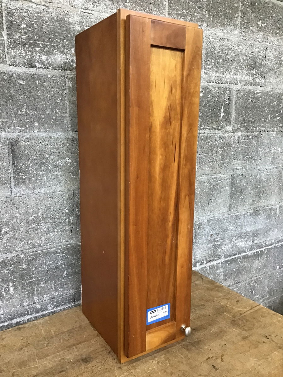 Narrow cherry upper cabinet with polished nickel knob.