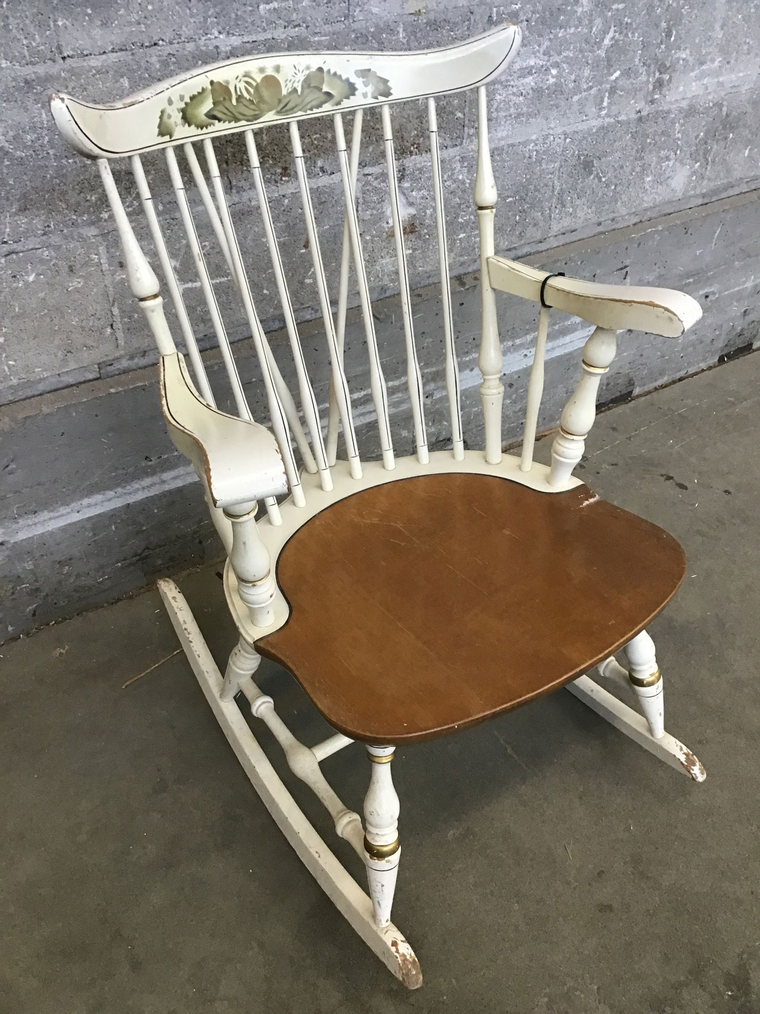 Lovely hardwood rocker with a sweet folksy paint job that looks original. May be an L. Hitchcock reproduction from sometime in the 20th century. Isn't the stenciled detail so charming?? Despite some wear appropriate to its age, it's in great shape - and yes, it's comfy!