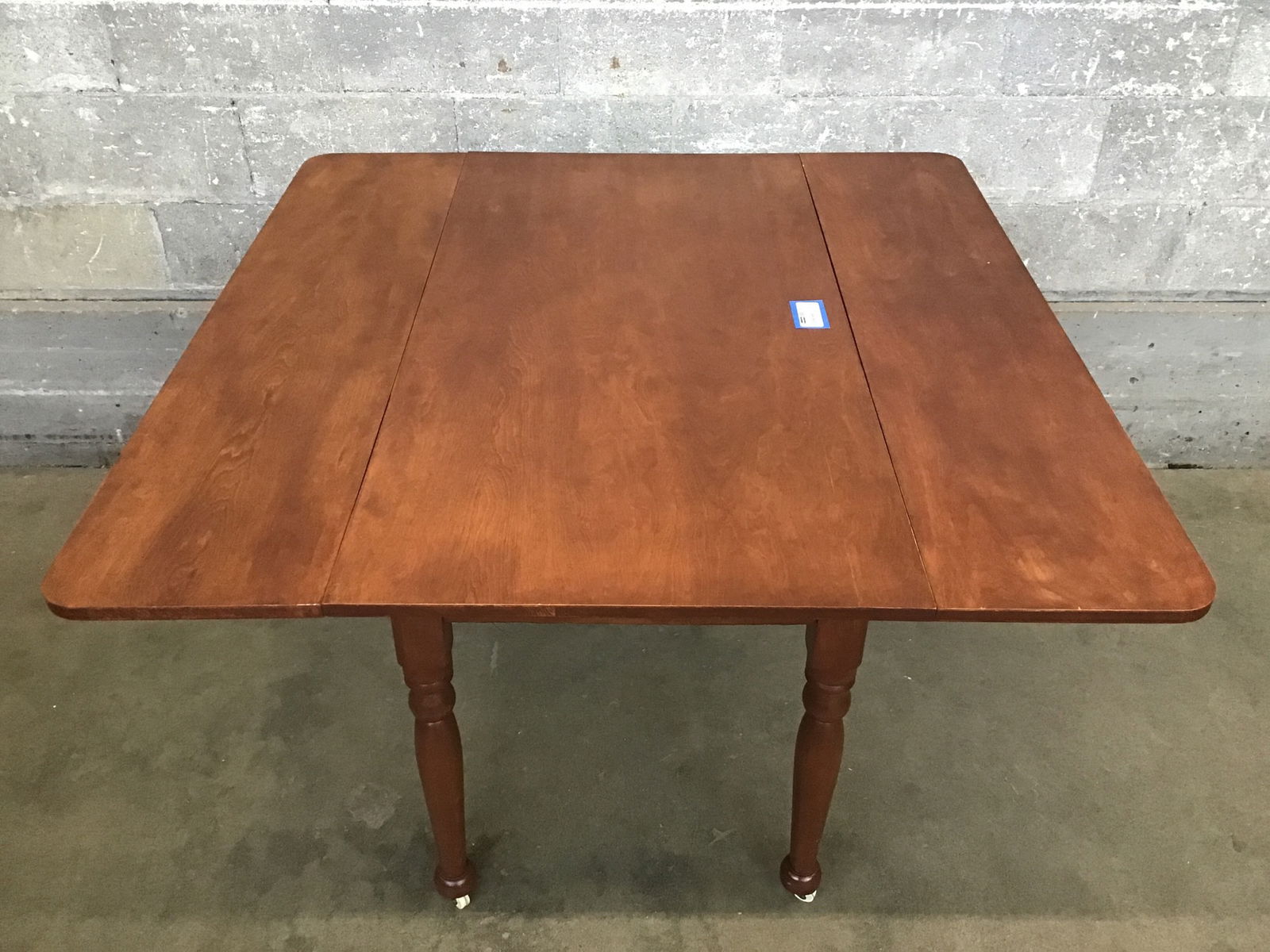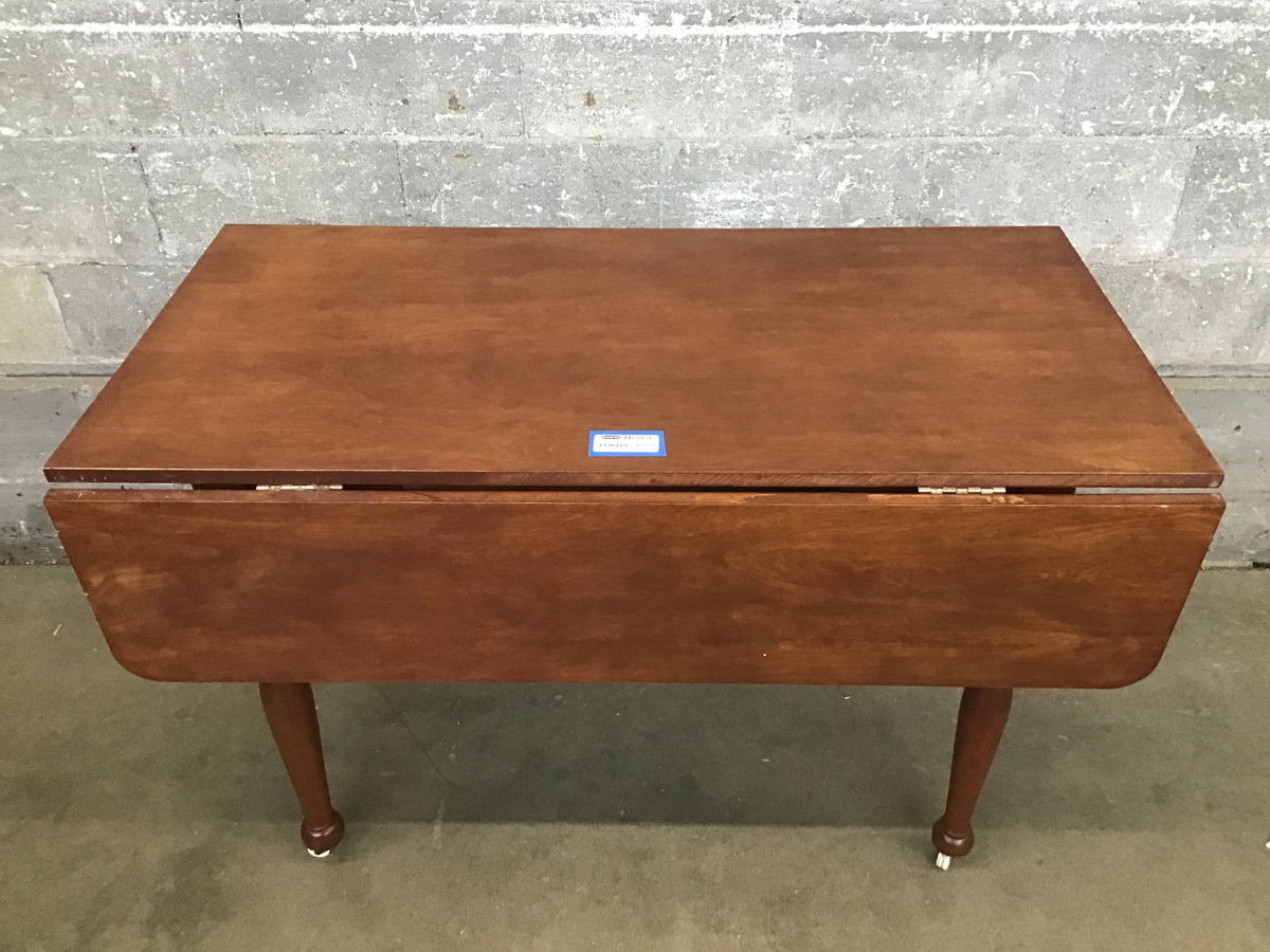 Dark stained maple dining table that rolls on four casters and has two fold-down leaves that add 22.5" to the total width of the table. Really clean and in good condition.
