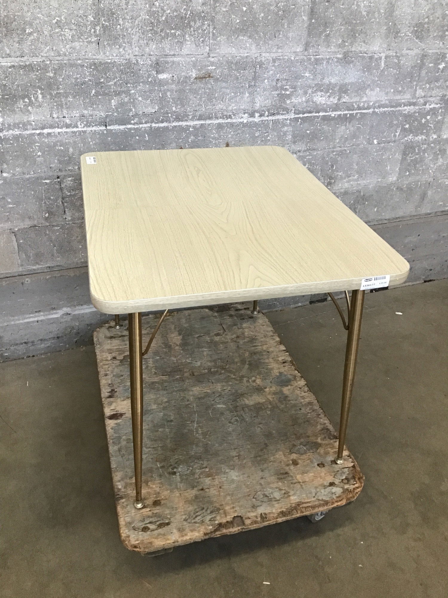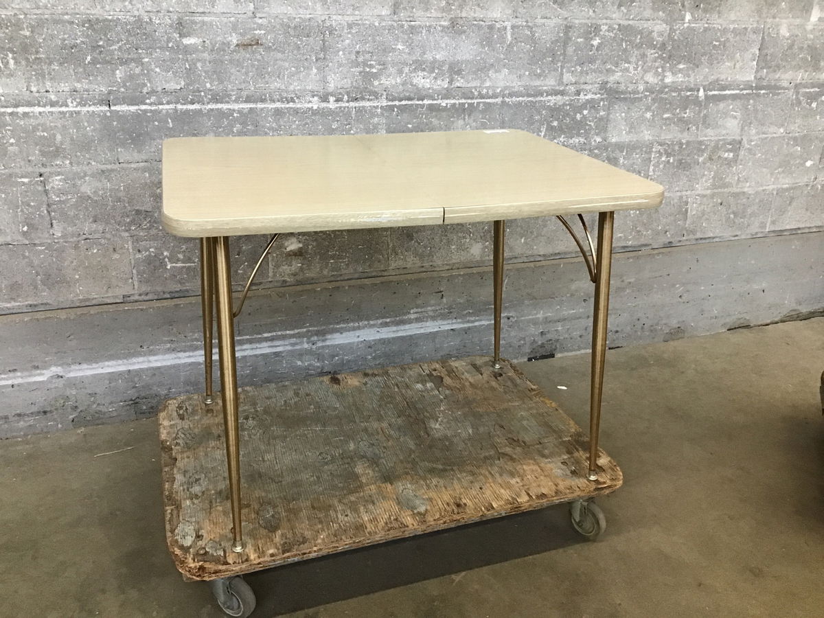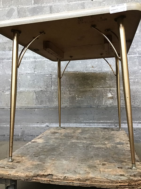 Ready to enjoy 1950's/60's kitchen table with a laminate top and gold brassy legs. The top is free of damage and no signs of delamination. This table extends but we do not have the extension leaf.