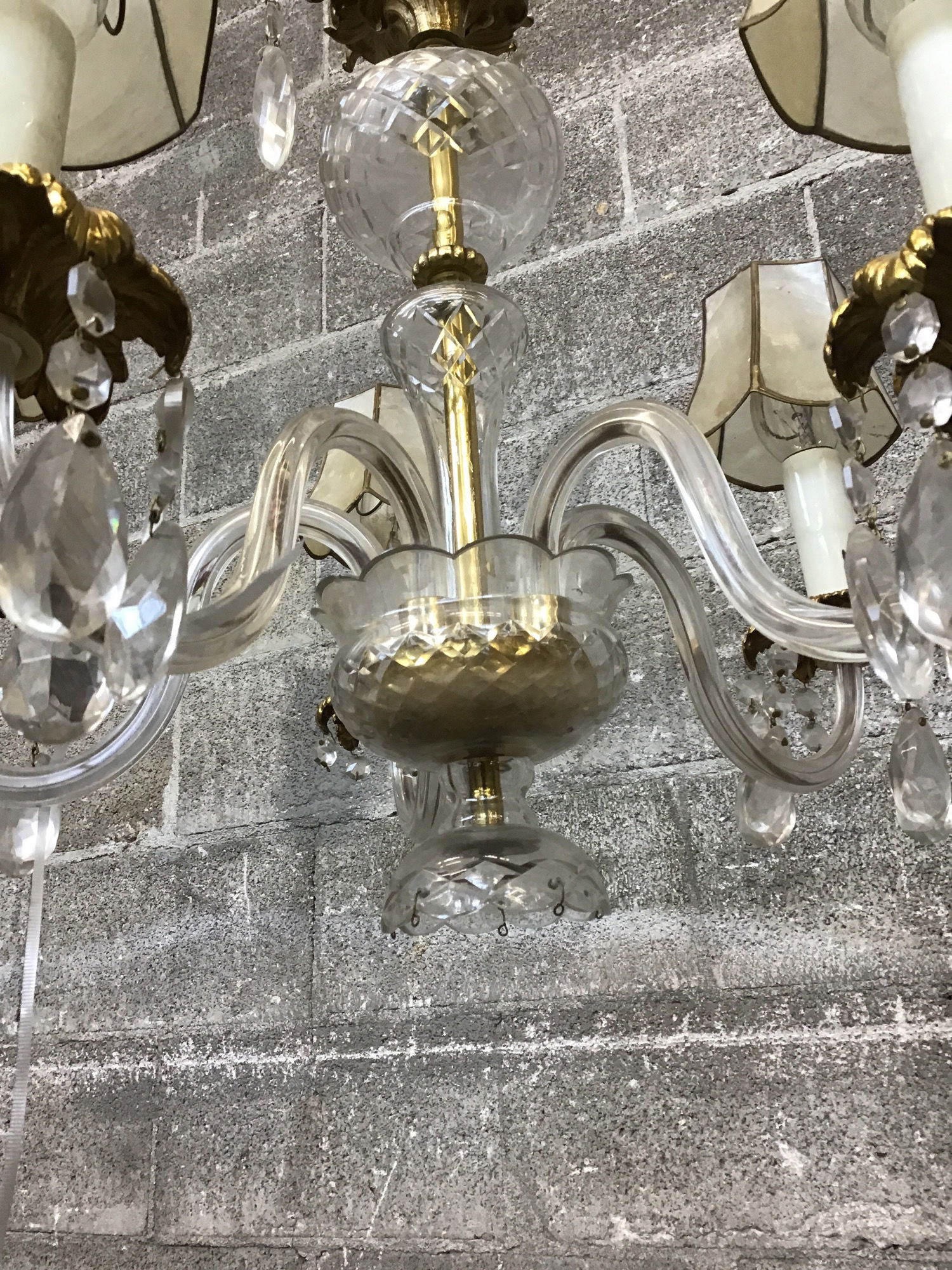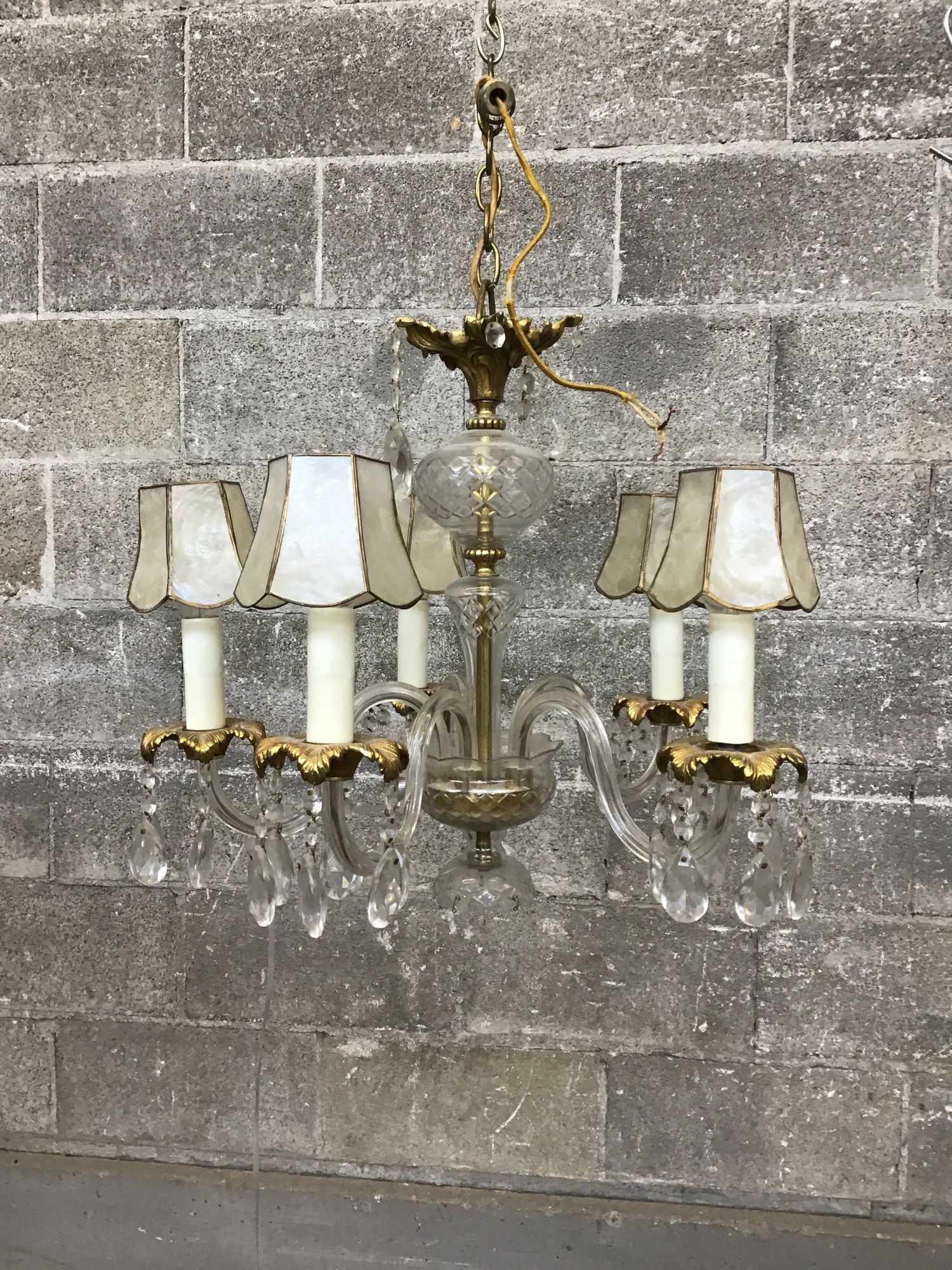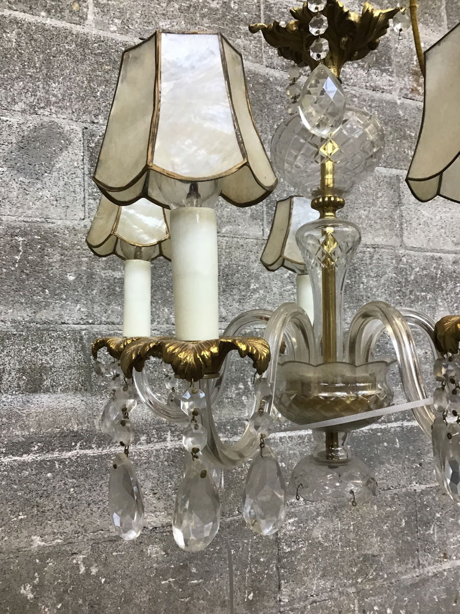 This antique brass and glass chandelier is quite a stunner and is "almost" ready for display. It features curvy glass arms, cast brass accents, and shades made out of capiz shell. None of its components are damaged, but it is missing some crystals and the original brass fitter. Overall the wiring looks ok but it needs a cleaning/polish