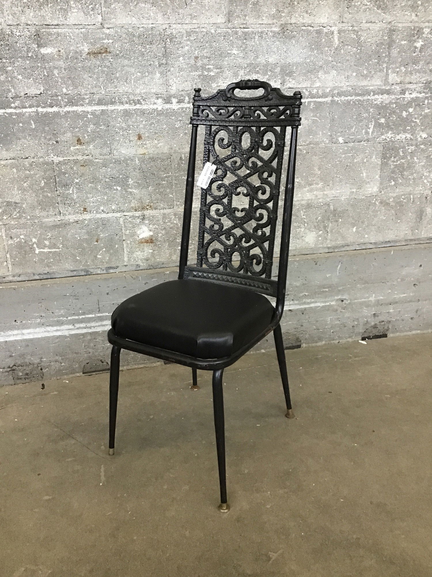 Tall back chair with a faux black leather cushion. This chair back is made out of a cast acrylic that resembles iron metal work. Overall in usable shape; no tares on the seat but it's dusty and missing a foot leveler. 18.5" seat height.
