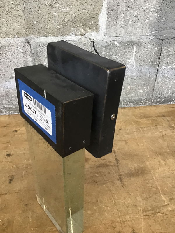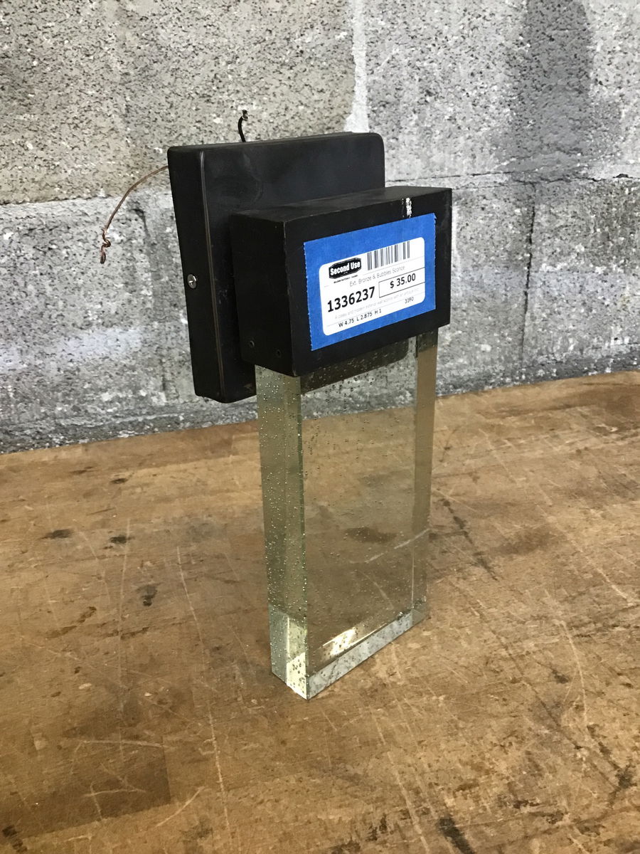 A classy and modern exterior wall sconce with an antique bronze finish to its canopy construction, with a big solid block of clear seeded glass in place of a fitter or shade. Retails new for about $85.