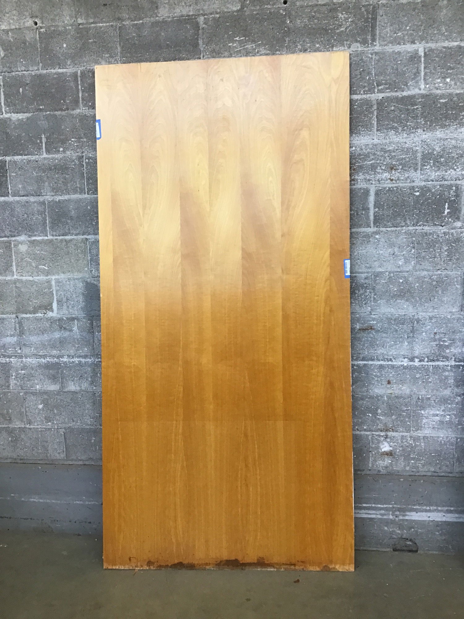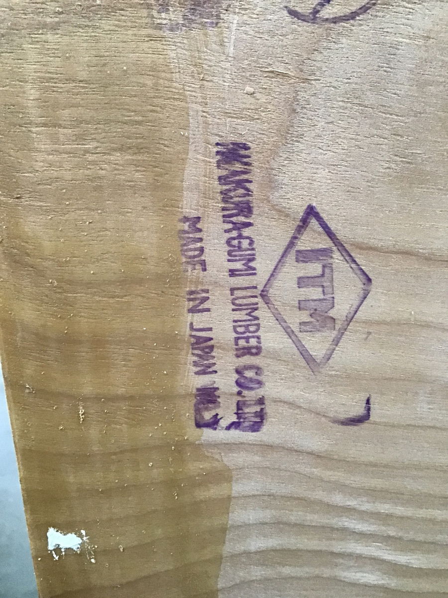 Nearly a full sheet of vintage plywood with a stamp from the 132-year-old Japanese manufacturer on the back: Nakamura Lumber Co. This sheet has a light stain on one side and was used as interior paneling prior to demo. There is a very small bit of damage along the bottom 2-5"