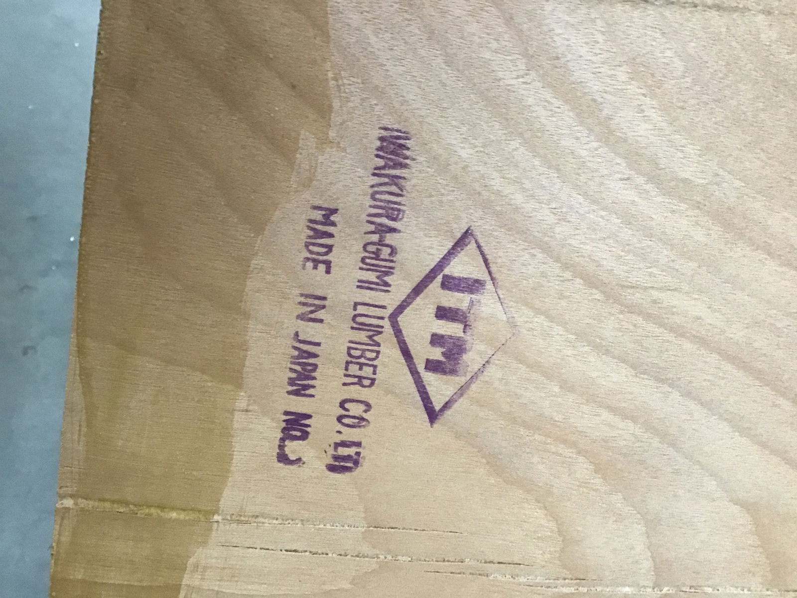 Nearly a full sheet of vintage plywood with a stamp from the 132-year-old Japanese manufacturer on the back: Nakamura Lumber Co. This sheet has a light stain on one side and was used as interior paneling prior to demo. The center cutout is roughly 35" x 30"