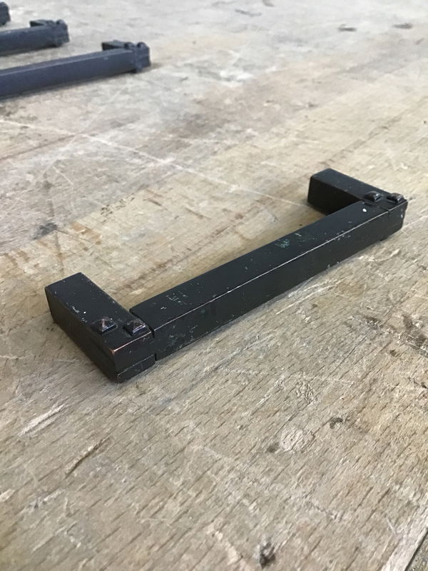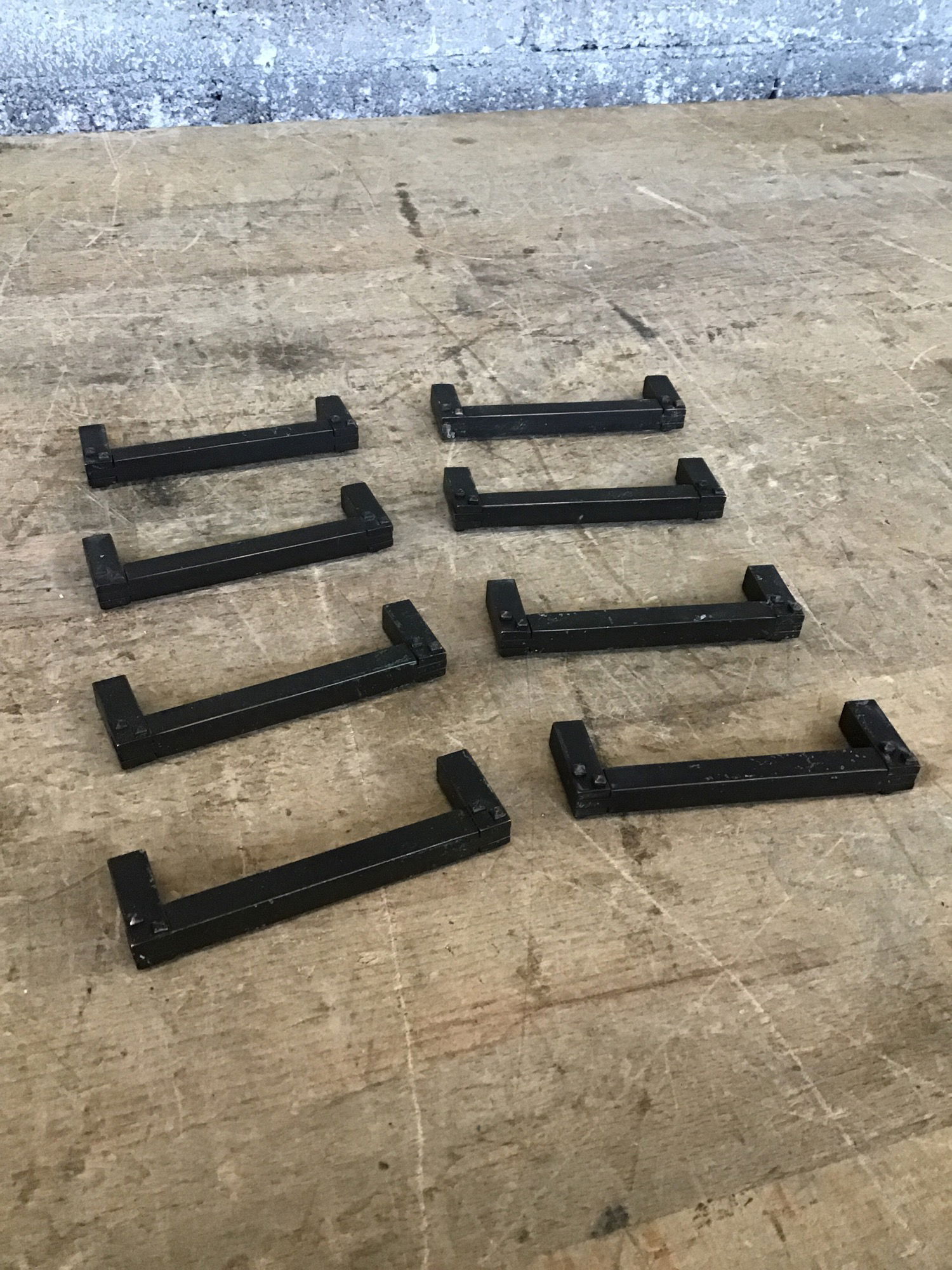 A pack of eight bar cabinet pulls designed to look like they're made with antique methods, all in an oil-rubbed bronze finish.