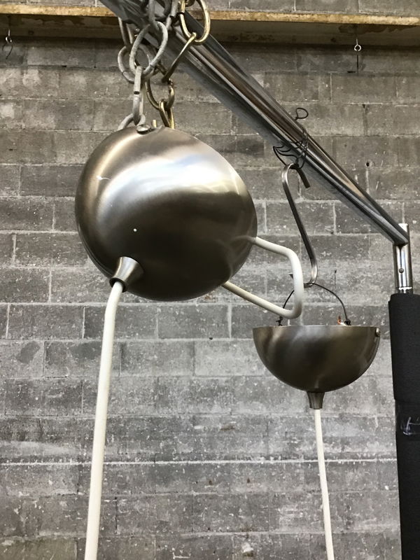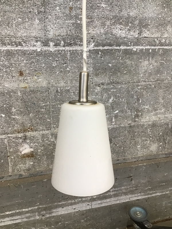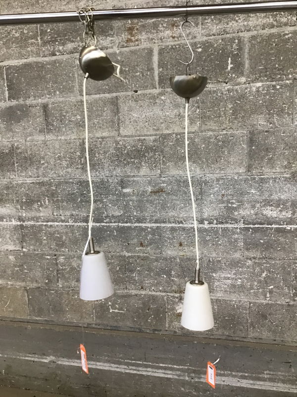 A pair of li'l pendants with frosted shades that have a two-tone finish from matte to glossy and a brushed nickel finish to its canopy.