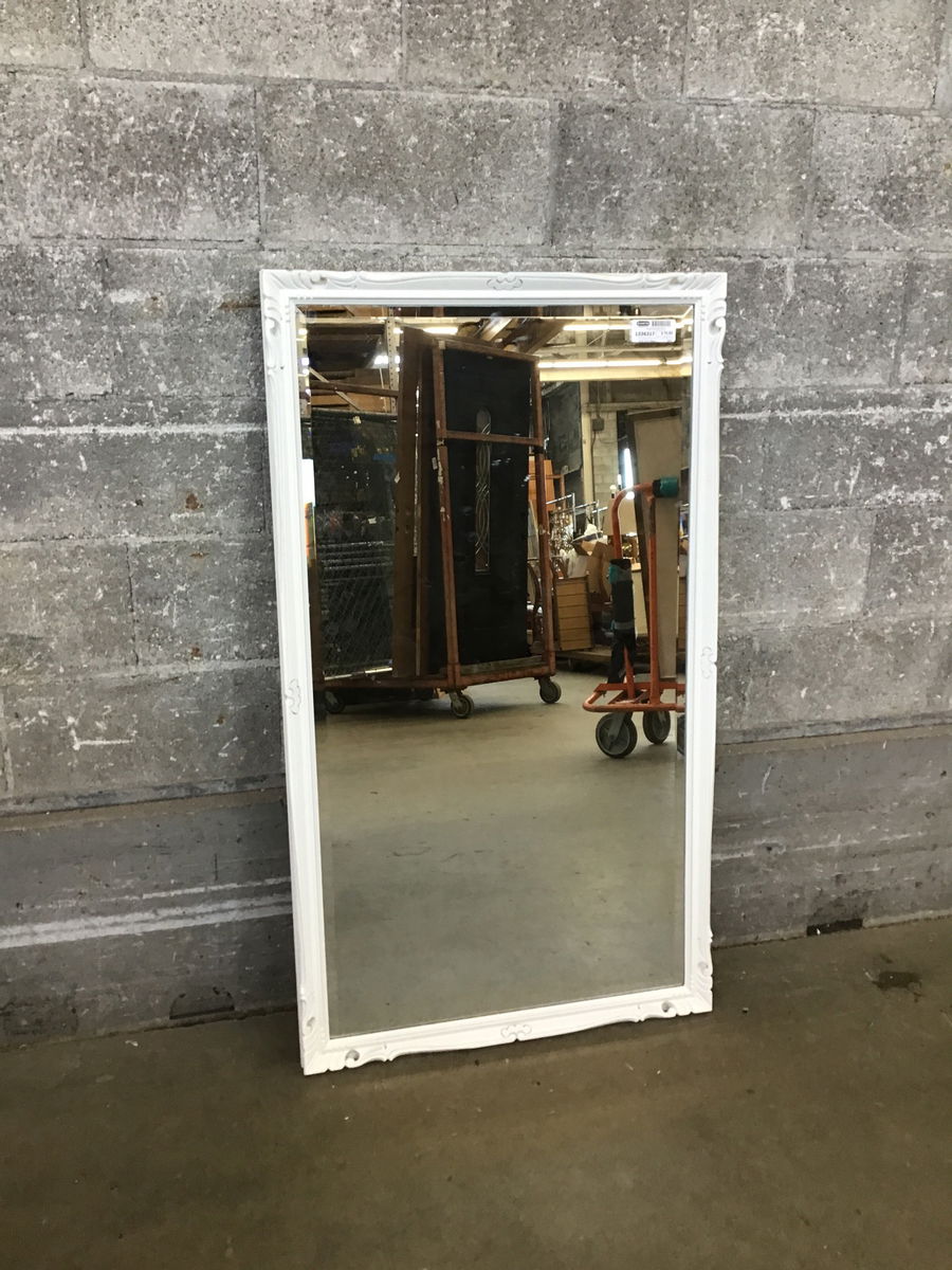 This is a quite attractive mirror with a more subdued Nouveau style frame that is painted white. The mirror itself looks amazing and has double bevels.