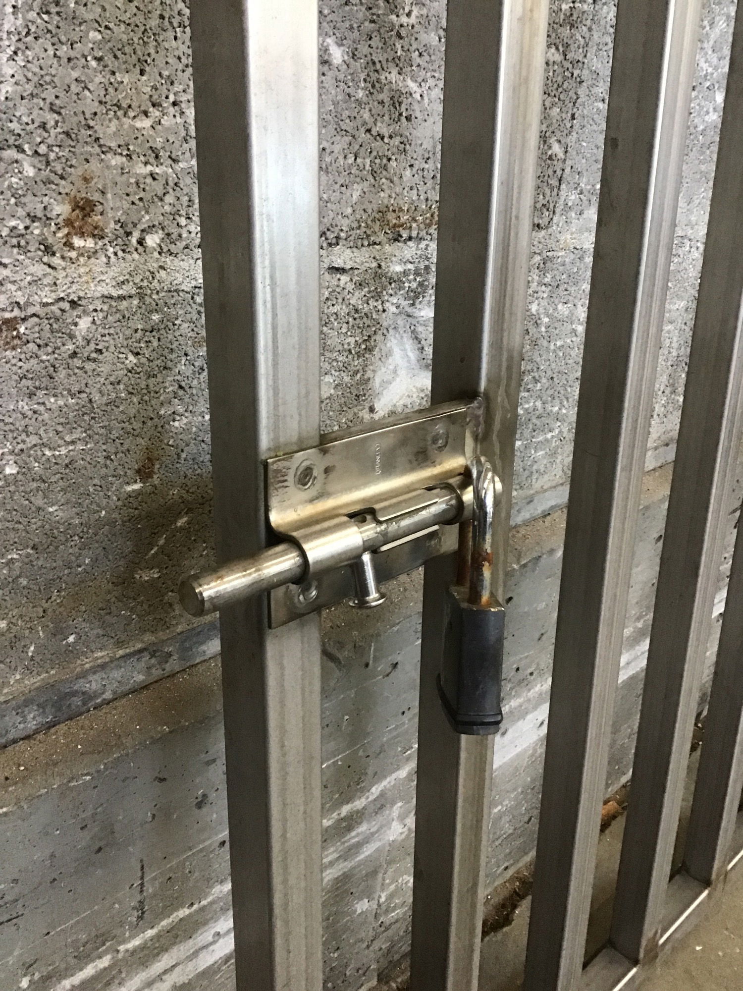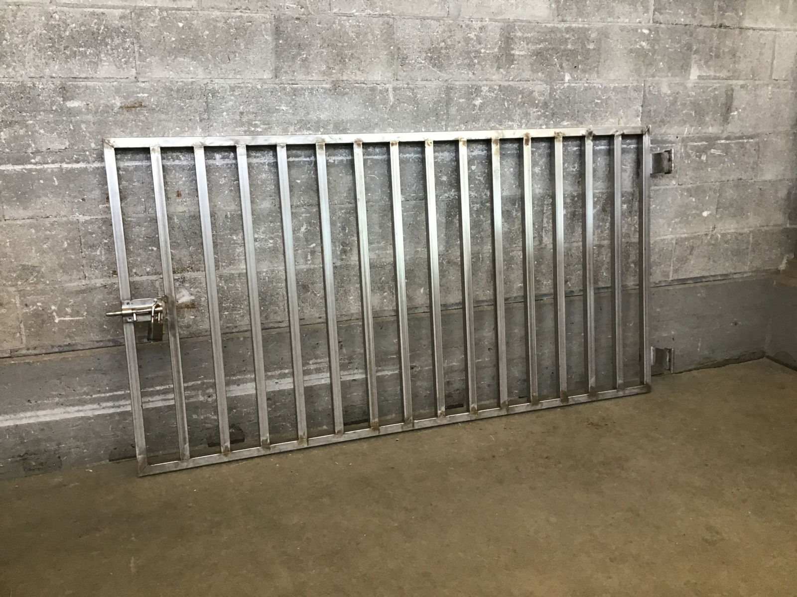 This is a short-ish stainless steel gate that is 6.5' in length. Made from 1.25" thick square tube steel. Gate has a slide bolt that has a padlock on it. No key for the lock so you will have to cut it off.