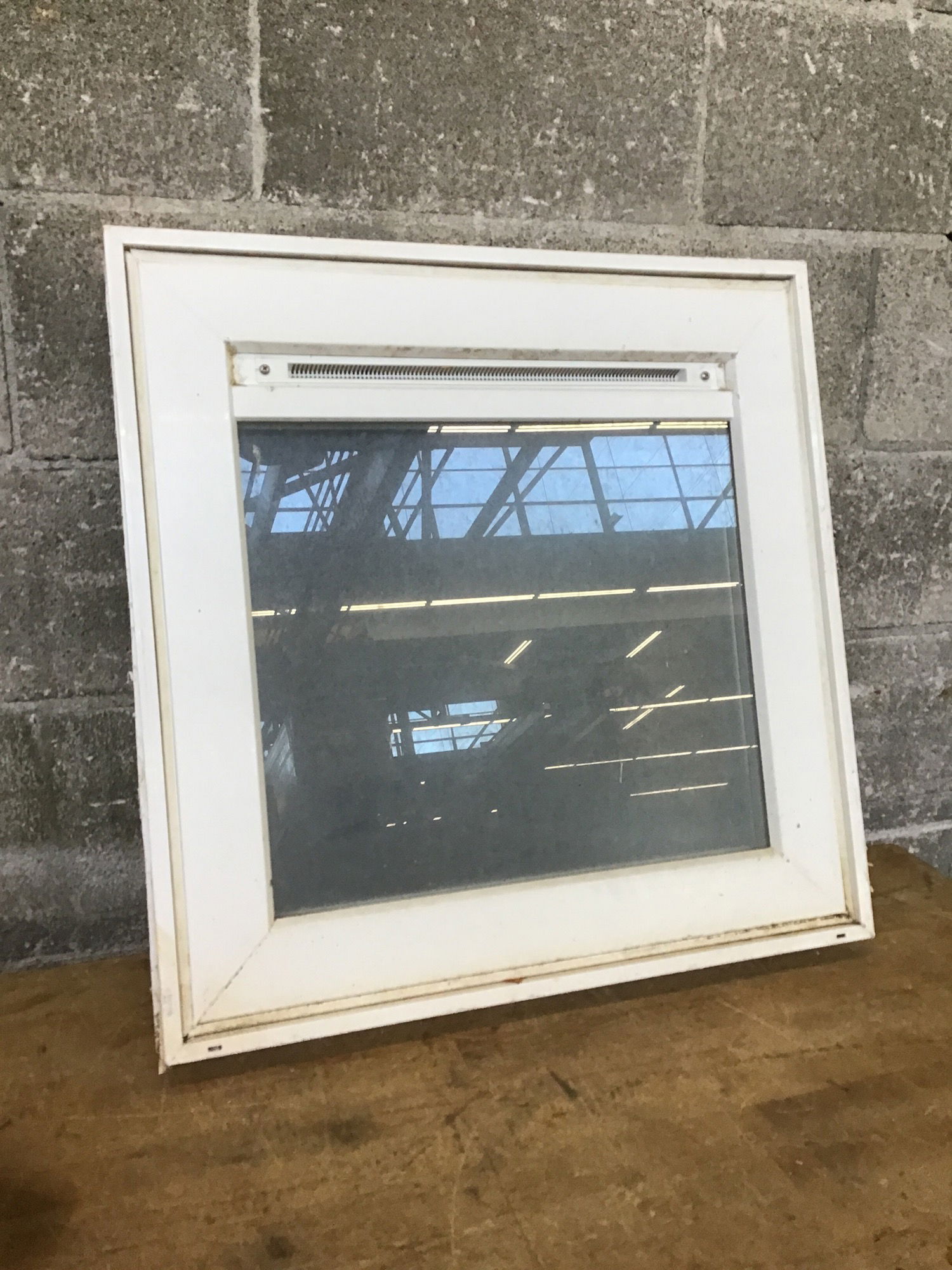 A vinyl casement window with pebble glass in good condition, sports a little air vent above the glass for ventilation- great for a bathroom! The 'lock' handle is broken, although it still functions properly. Price reflects condition.