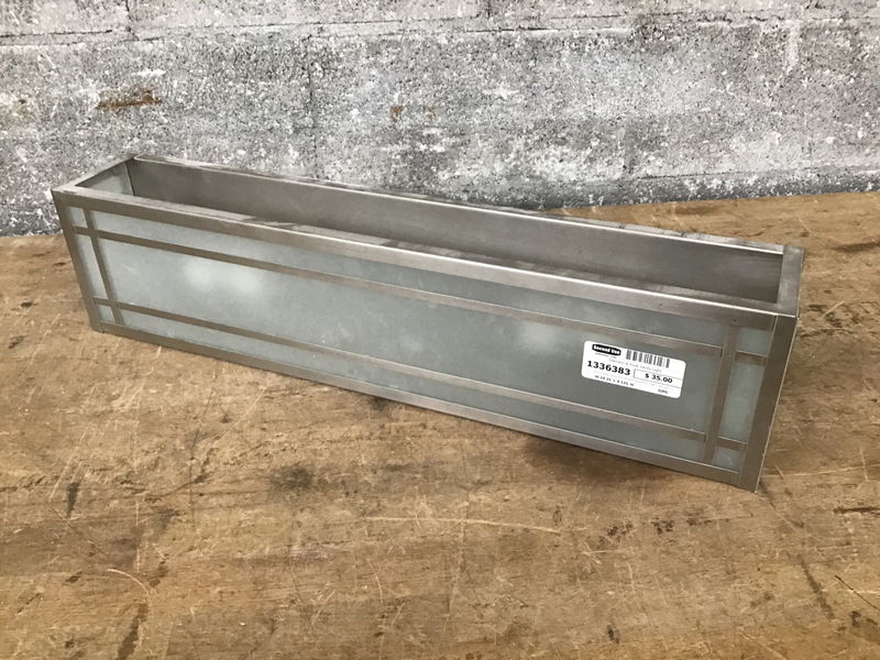 A four-bulb vanity fixture sporting some modern stylings in its stainless steel construction and three panes of frosted glass around the bulbs- one in front, and two on the sides.