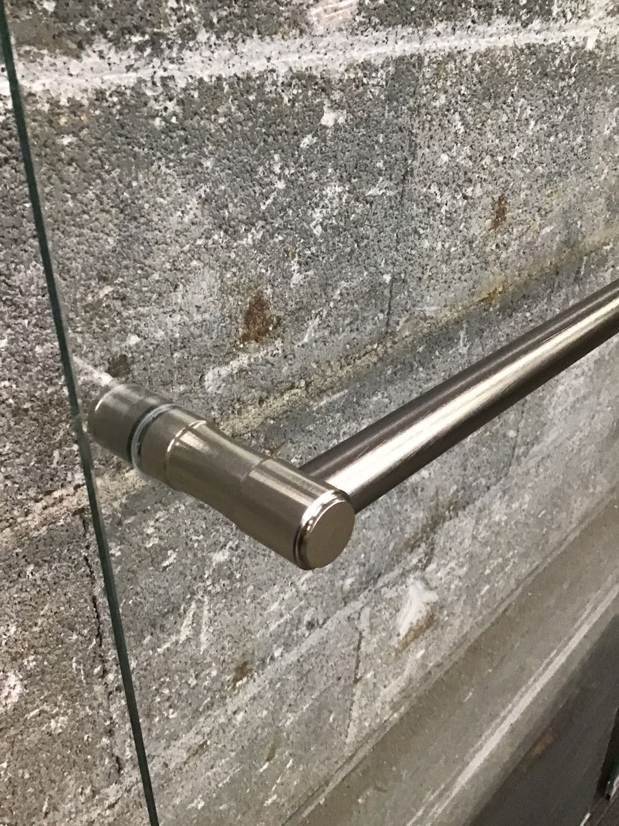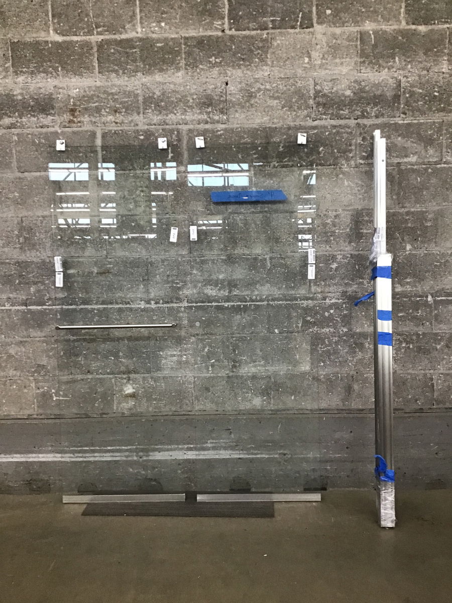 Frameless sliding glass shower doors with brushed nickel hardware and polished aluminum track. The track is 69.25” wide. Each door: 24” x 70”