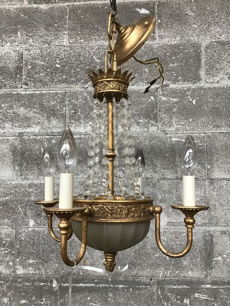 If you enjoy the French Empire style of lights but tend to balk at how large and cumbersome they usually are, then this is the solution! This is everything you would want from a French Empire style chandelier but small enough to fit in even the tiniest of apartments. This chandelier has 4 arms that attach to a brass body with ornate detailing in the casting and a fluted bowl shade. Also features 12 short chains of crystals that span down from the petal-like crown. Luxury lighting in a small package!