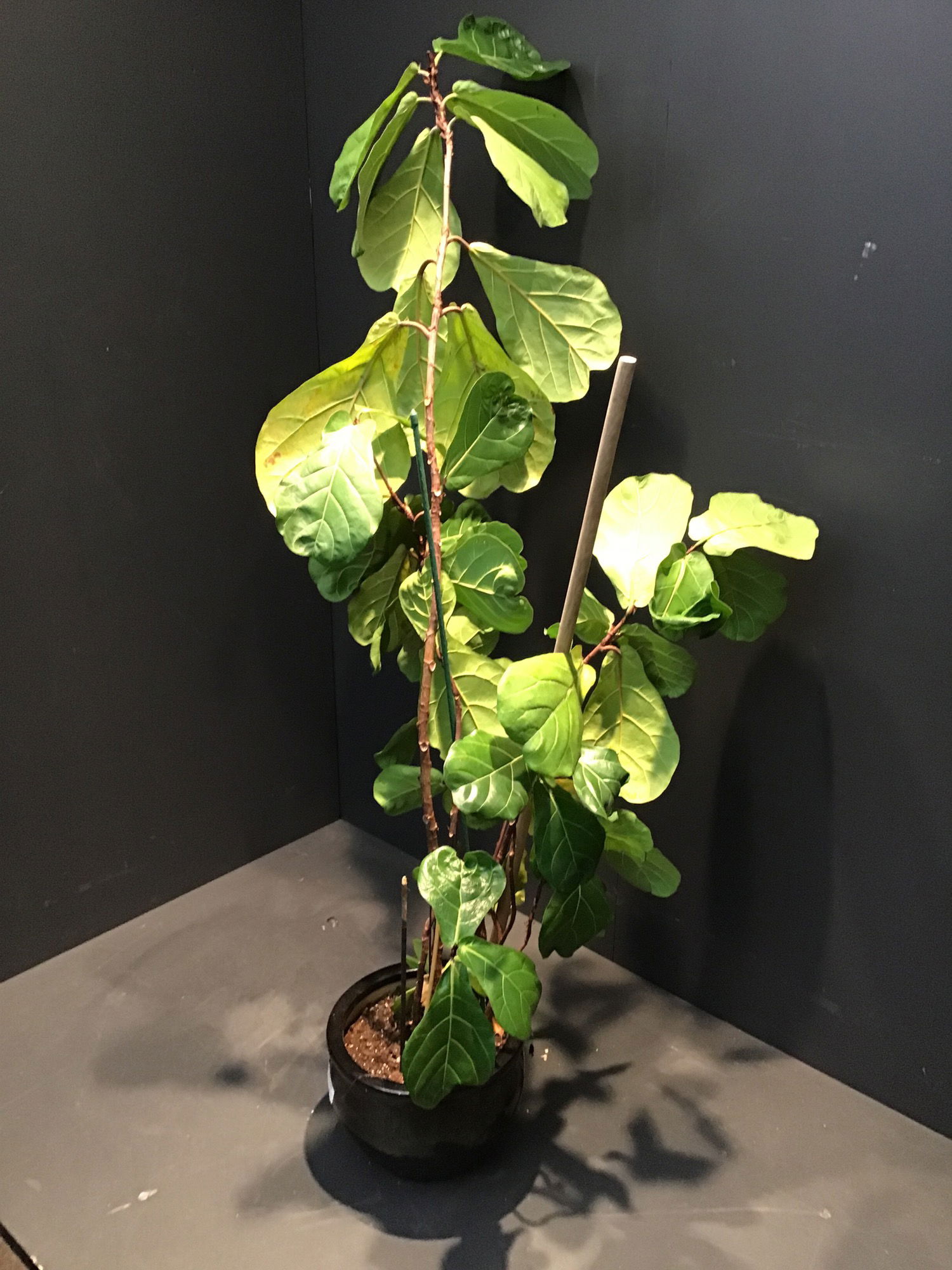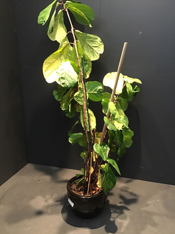 Lovely and large fiddle-leaf fig plant in a black ceramic pot. Seems to be in decent health it might need a little TLC but someone with a green thumb should be able to make a nice home for it. Has 2 wooden support rods to keep it up as it's pretty large!